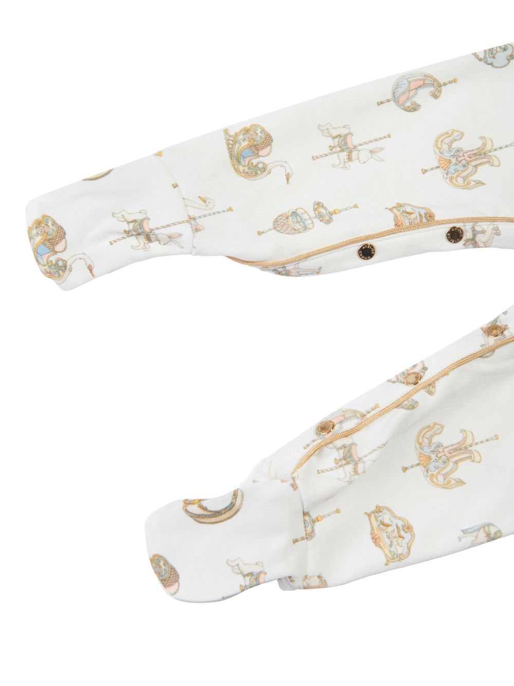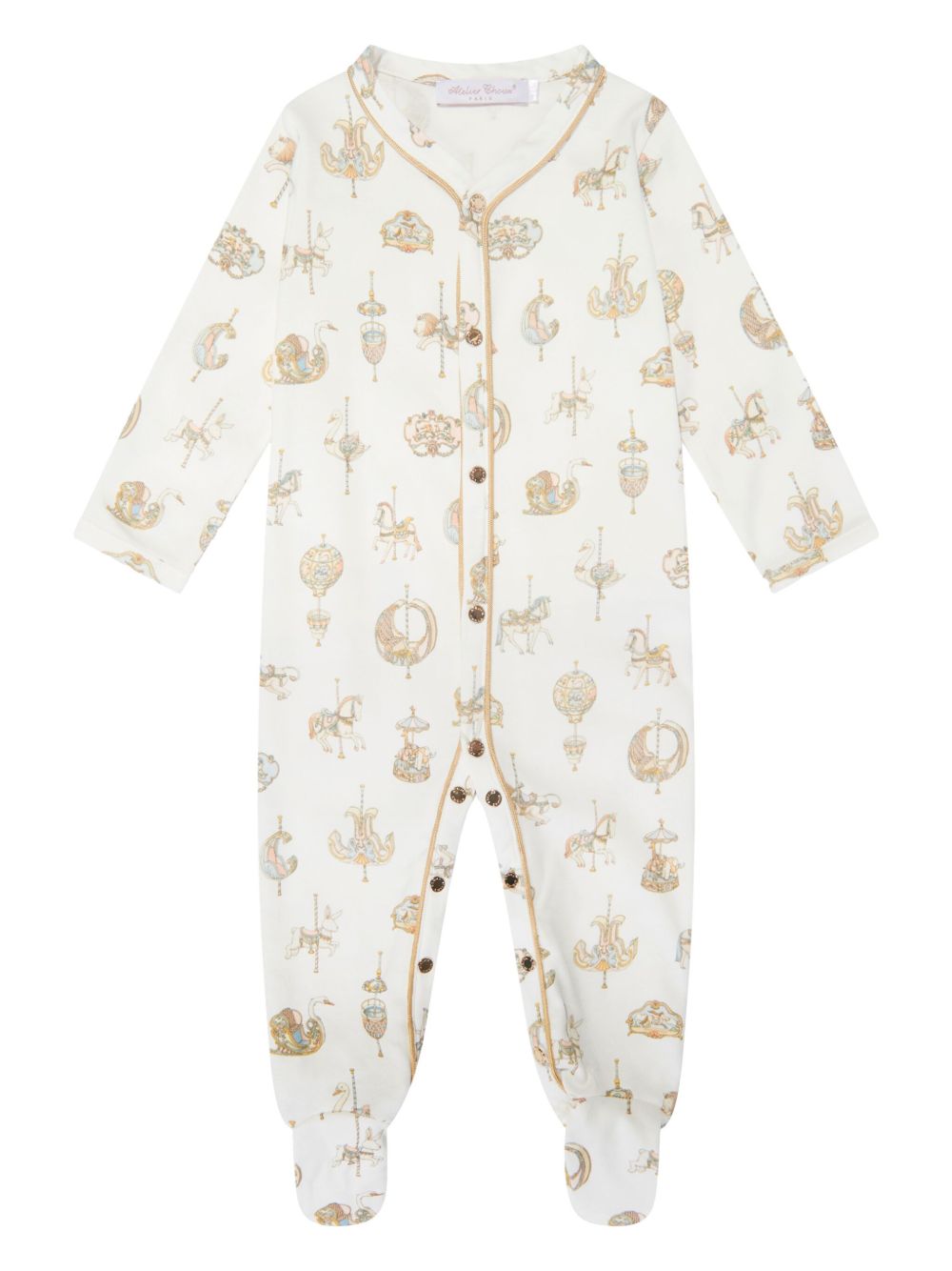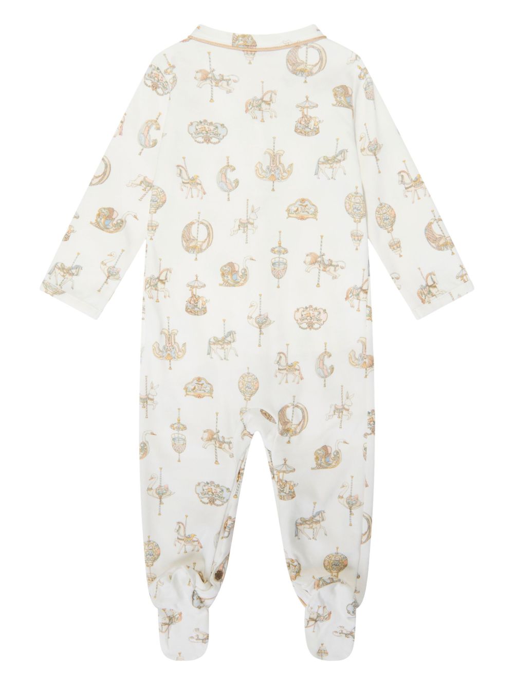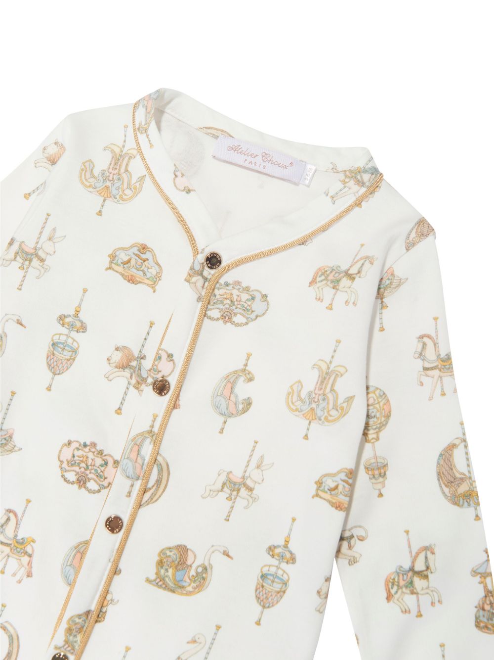 morbido jersey di cotone bianco/multicolore, stampa grafica all-over, chiusura frontale con bottoni, scollo a V, maniche lunghe, gamba dritta, copri piedi