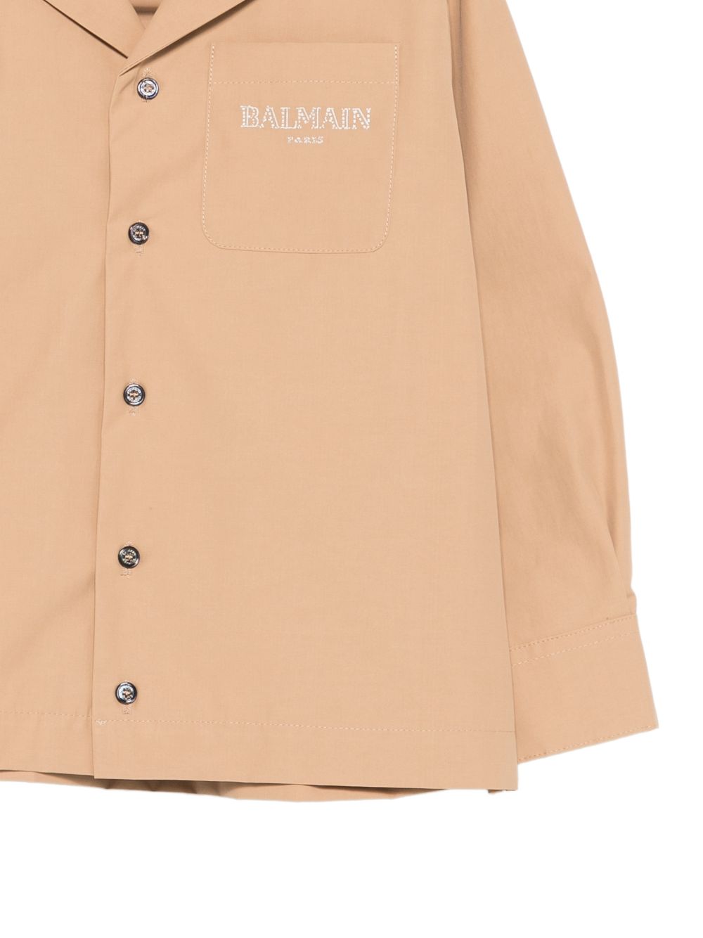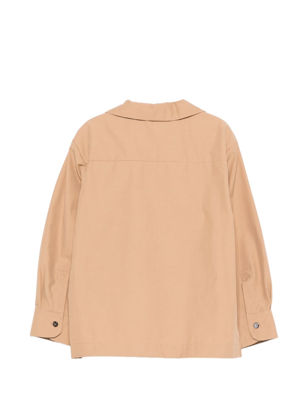 Camicia beige, taschino sul petto, logo ricamato, colletto classico, chiusura a bottoni.