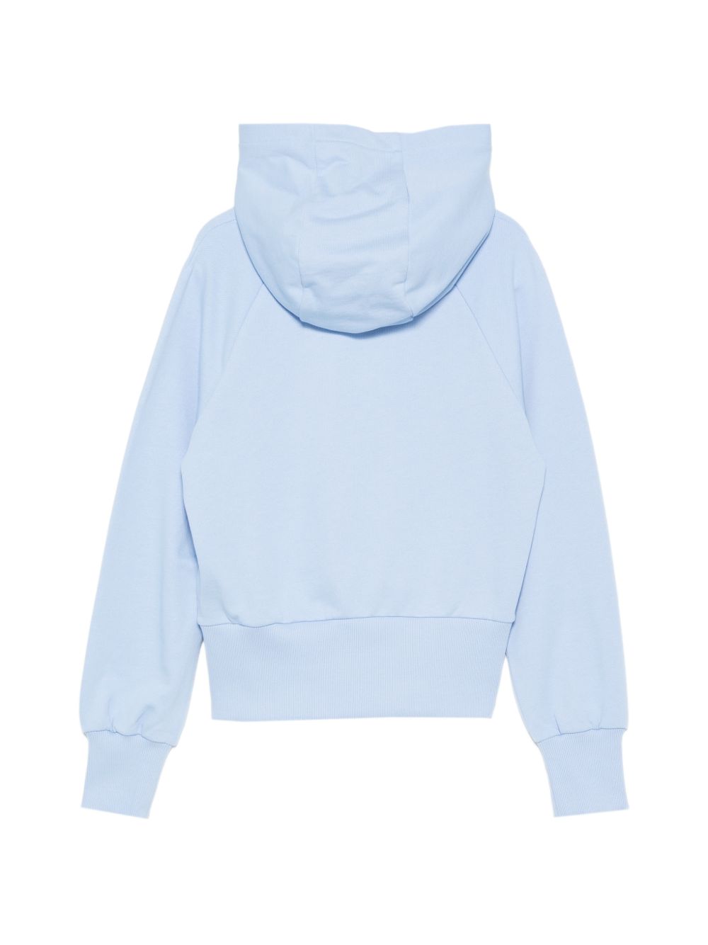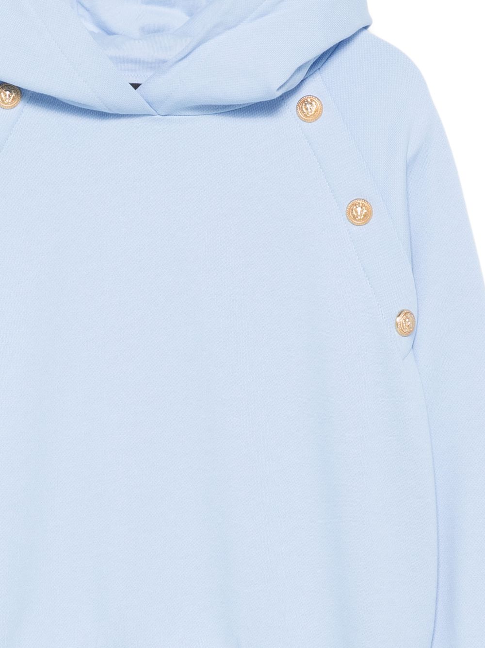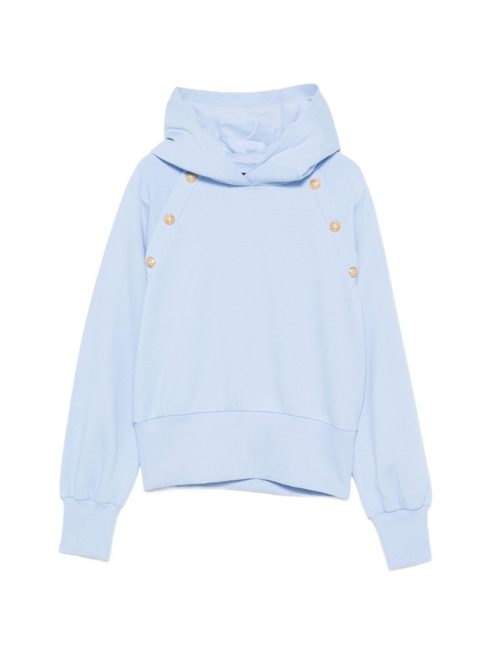 Felpa azzurro cielo, bottoni color oro, maniche lunghe, con cappuccio, polsini a coste e orlo a coste.