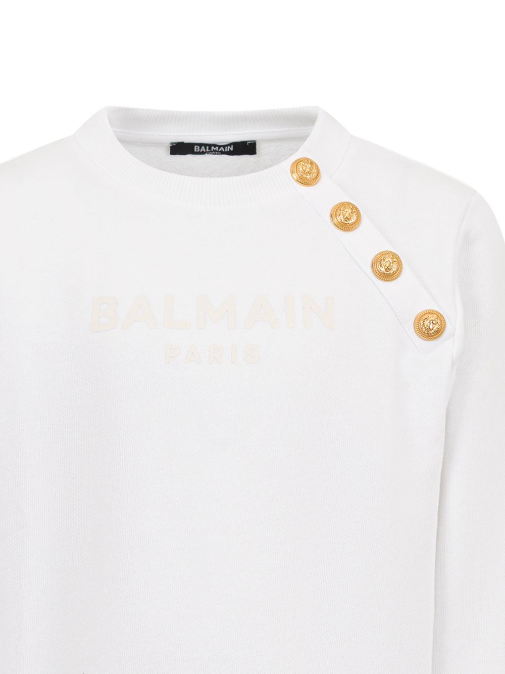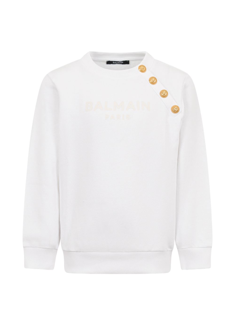 Felpa girocollo, bianco, bottoni decorativi, motivo tono su tono, orli e polsini a coste.