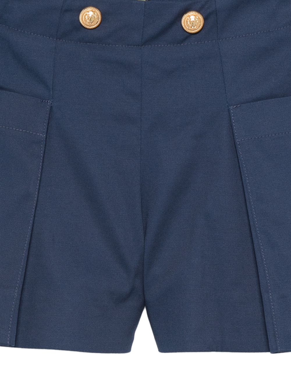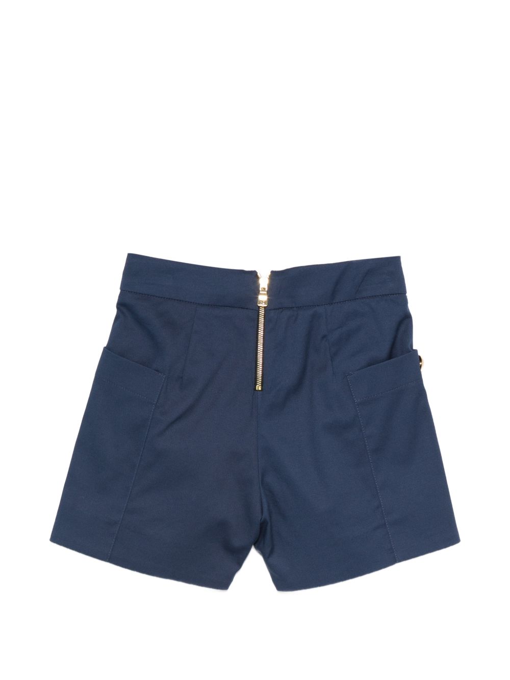 Shorts navy, dettagli bottoni oro, chiusura con zip, dettaglio plissettato.
