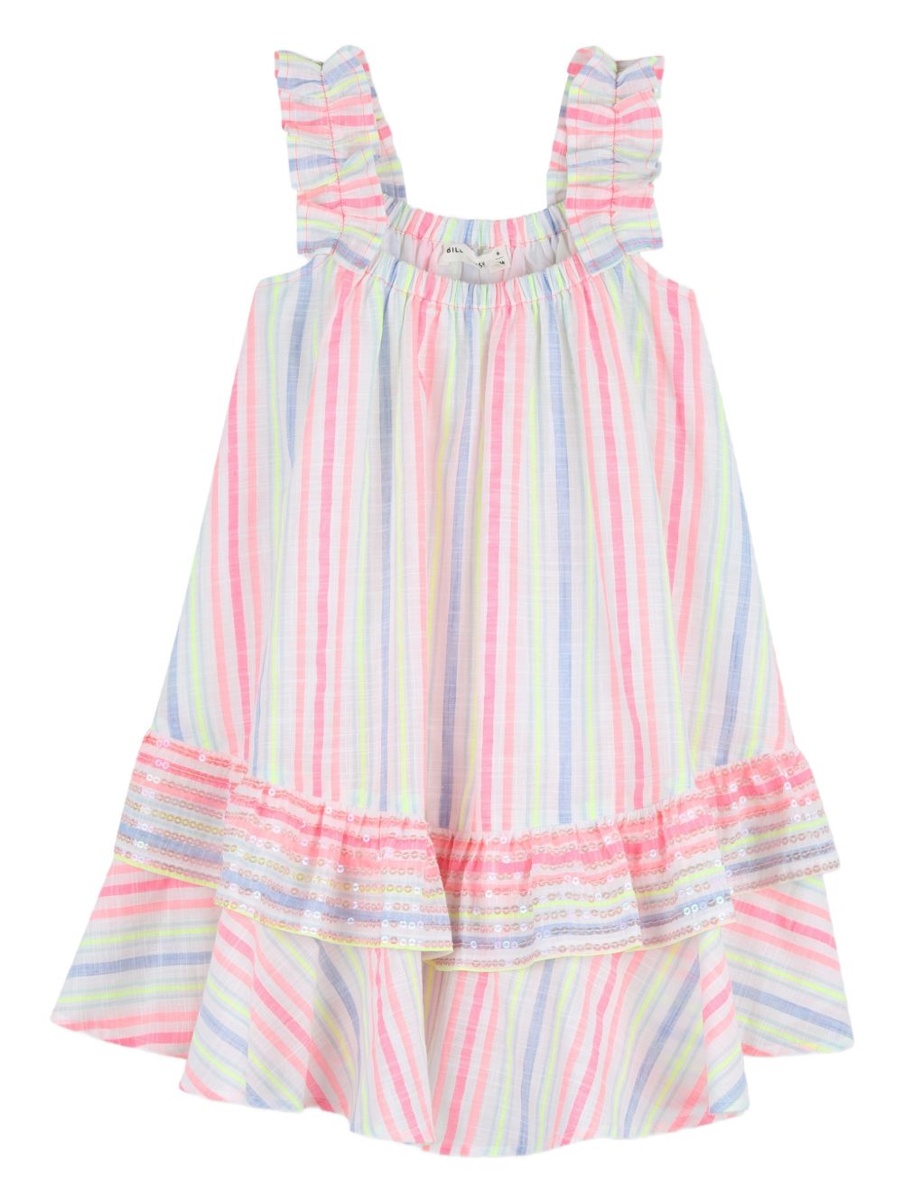 Abito con gonna a balze senza maniche con motivo a righe rosa e multicolor