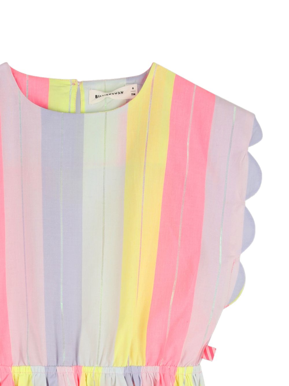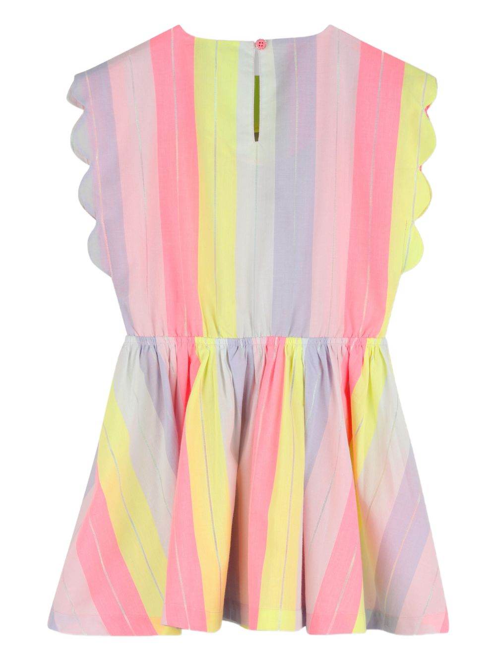Abito senza maniche, con vita arricciata, rifiniture smerlate a righe verticali rosa e multicolori