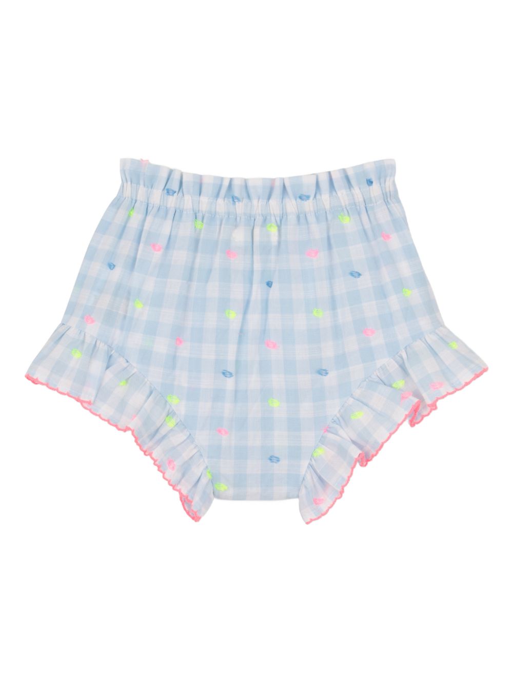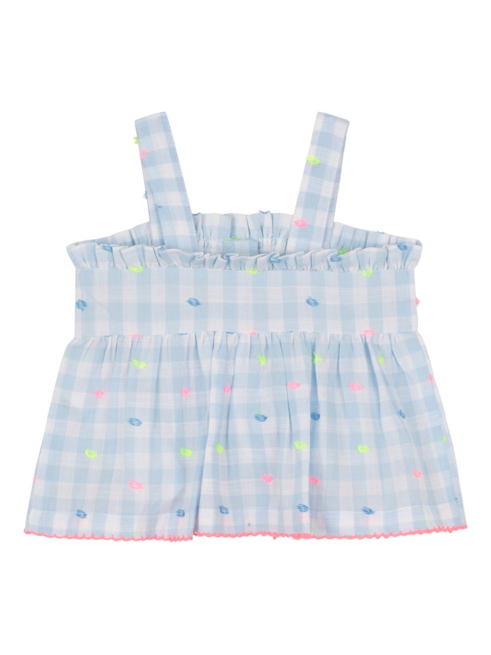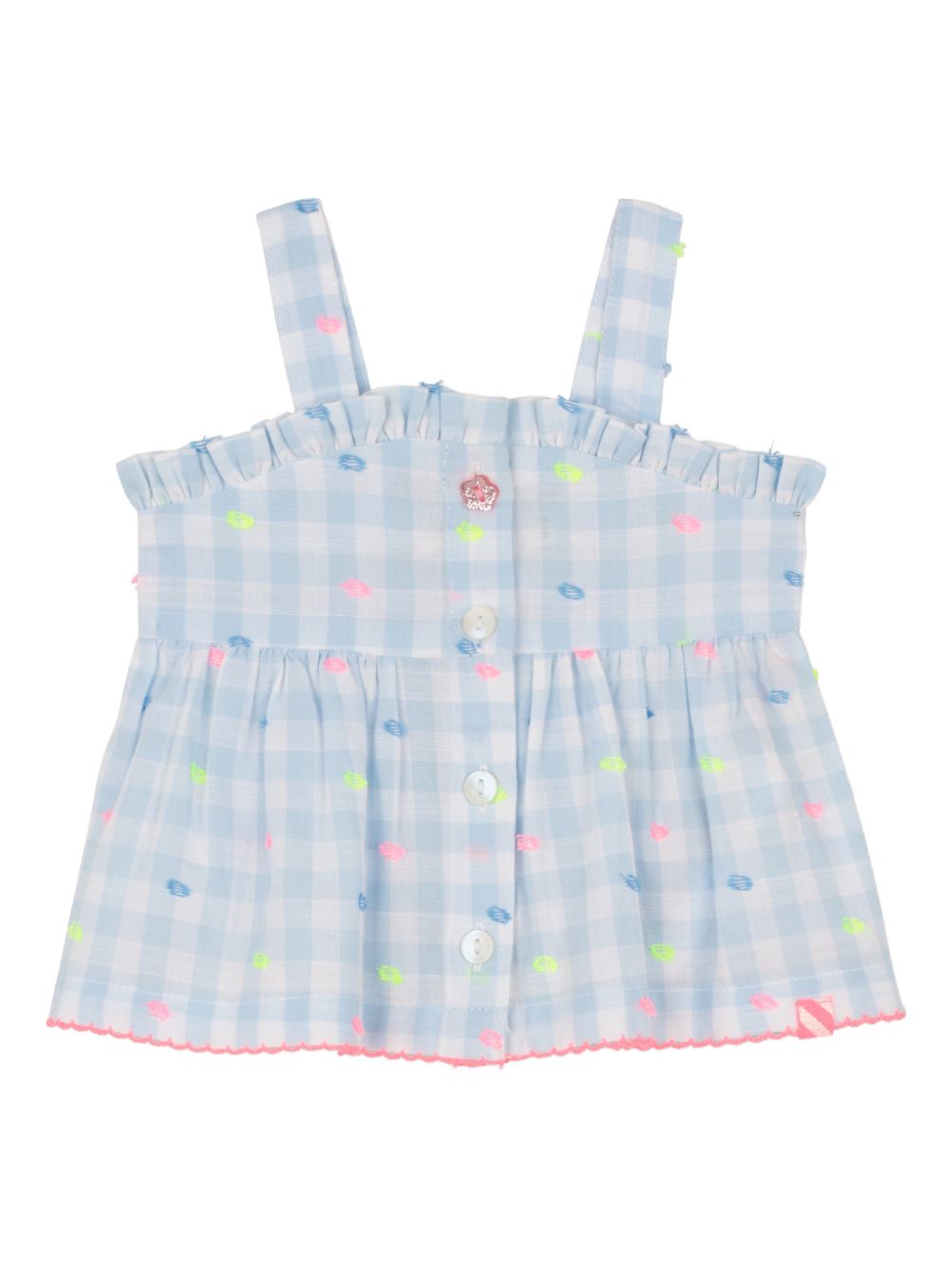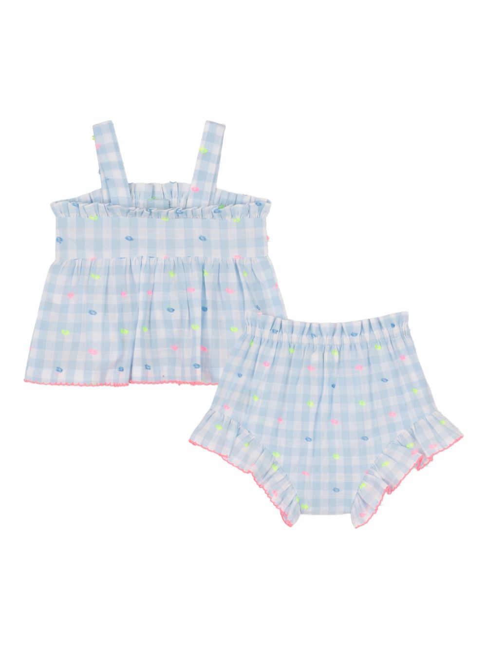Baby set composto da top con spalline con motivo a quadri azzurro e bianco, finiture arricciate, dettagli ricamati e coulotte