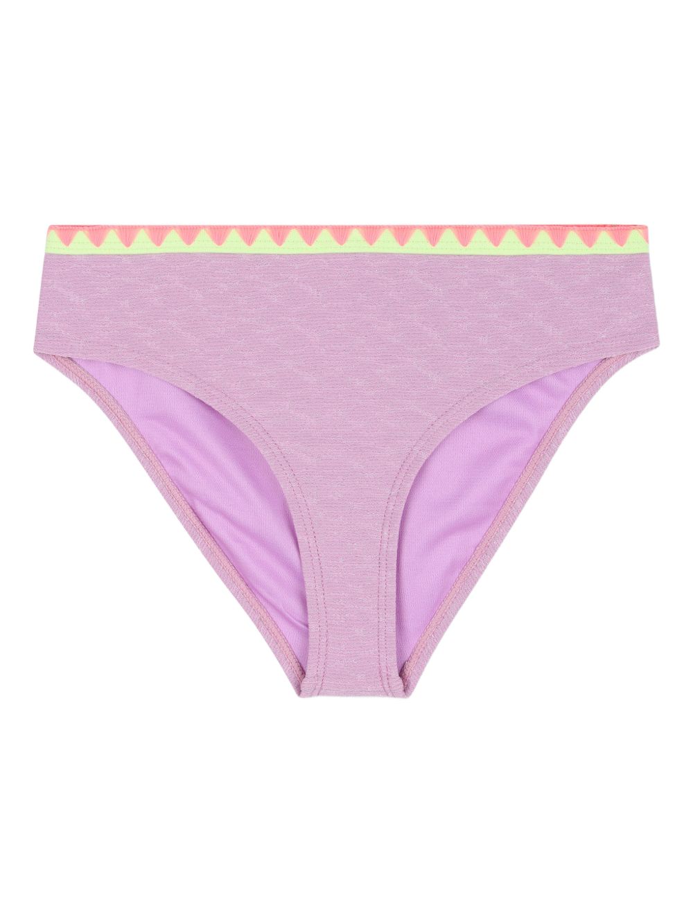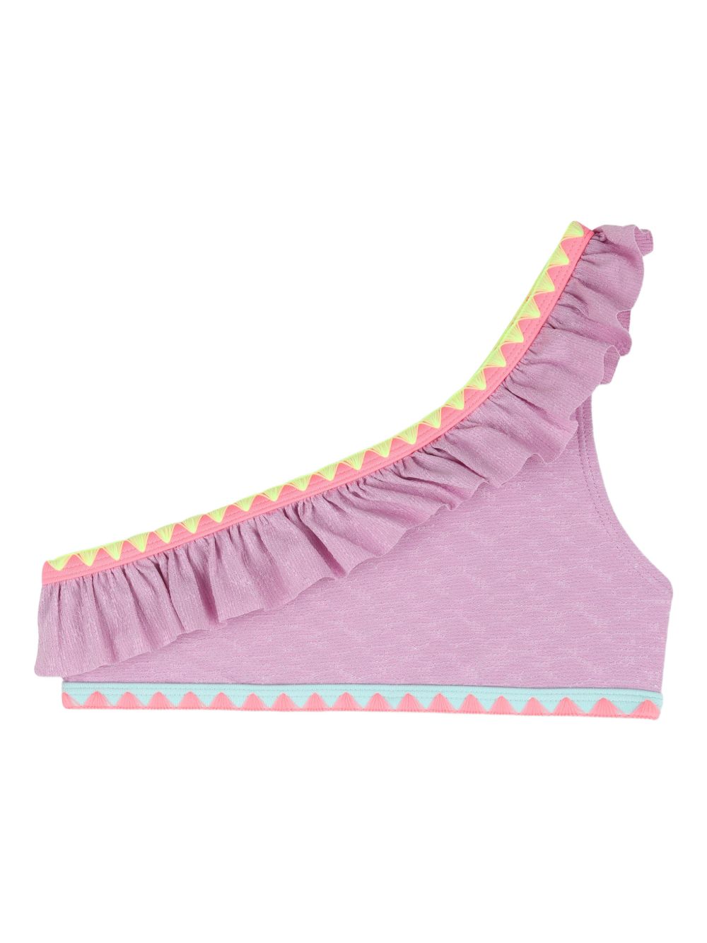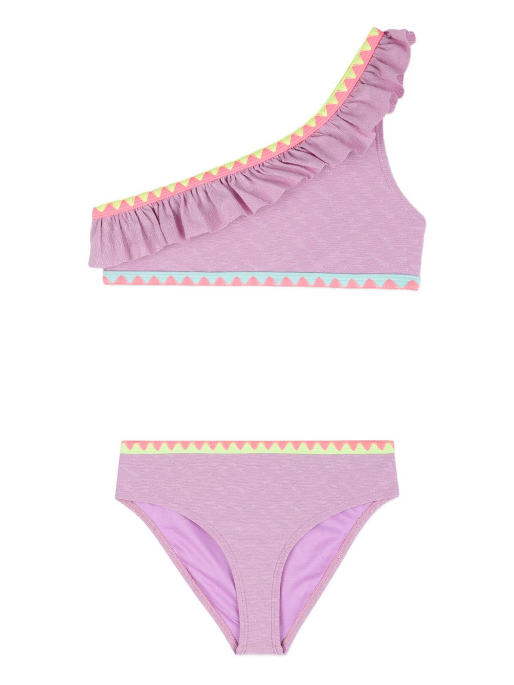 Completo due pezzi con volant viola, monospalla, motivo geometrico, bordi elasticizzati. Ricordatevi di provare il costume da bagno sopra i vostri indumenti.