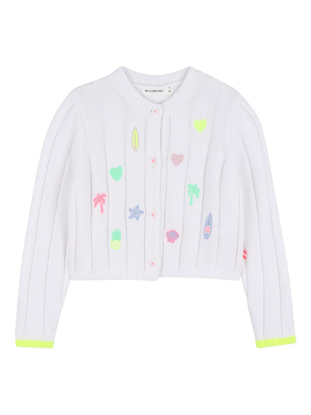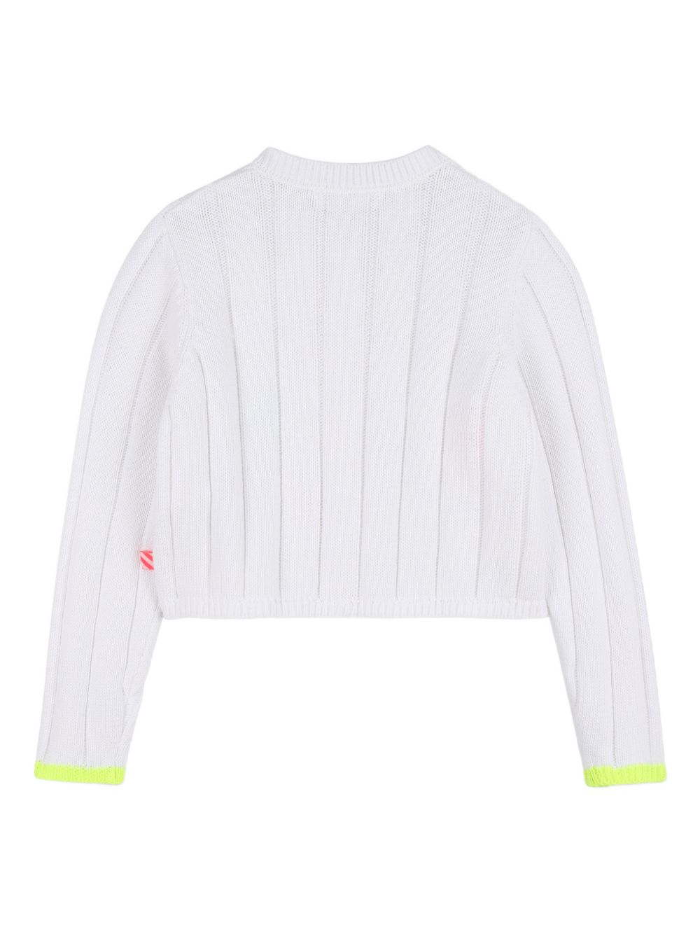 Maglia bianca a coste girocollo chiusura con bottoni maniche lunghe motivo ricamato