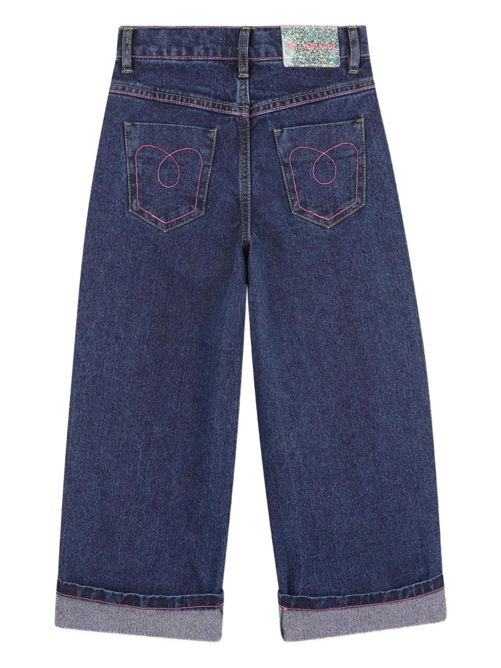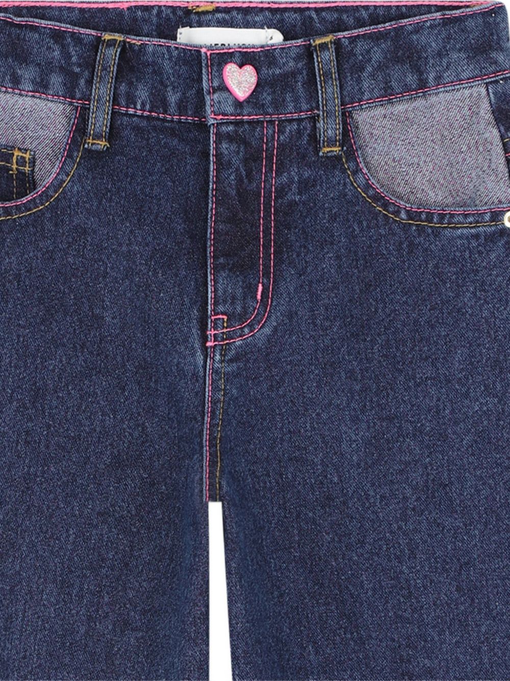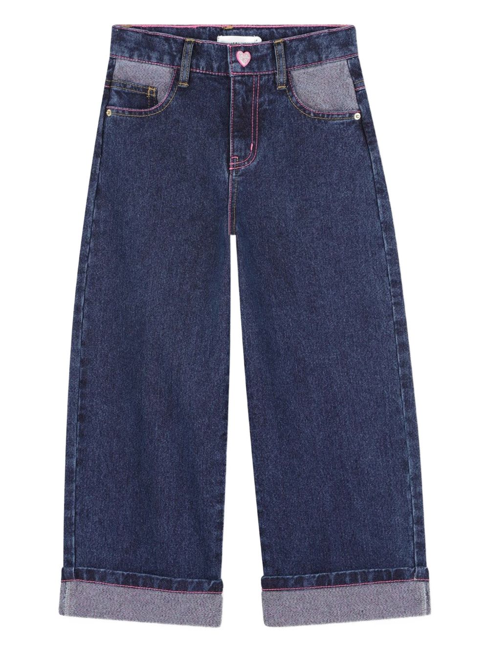 Pantalone con orlo risvoltato blu scuro, tasche anteriori e posteriori, cuciture a contrasto, motivo a cuore.