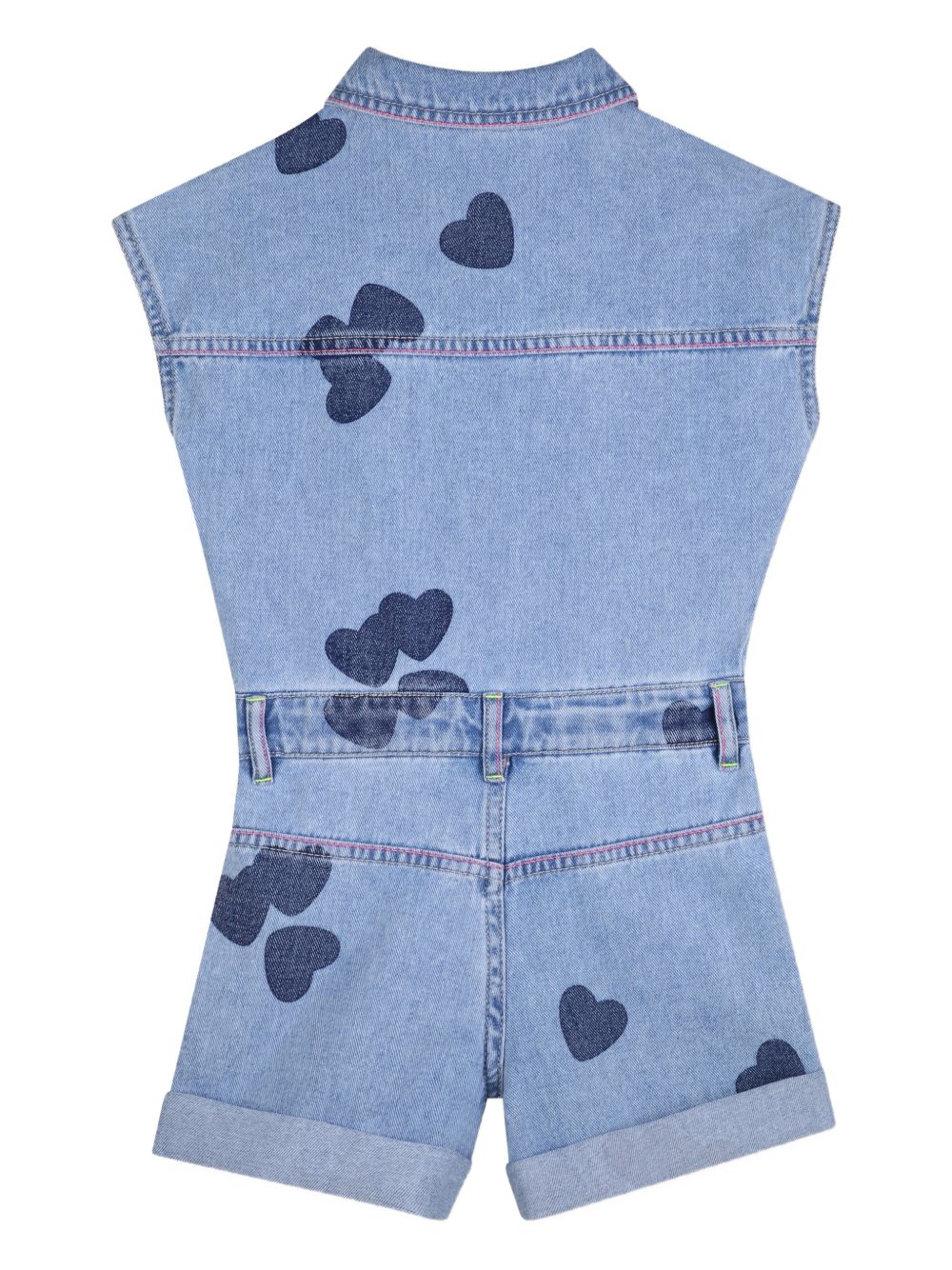 motivo a cuore azzurro, polsini risvoltati, cintura, colletto a punta, chiusura con bottoni