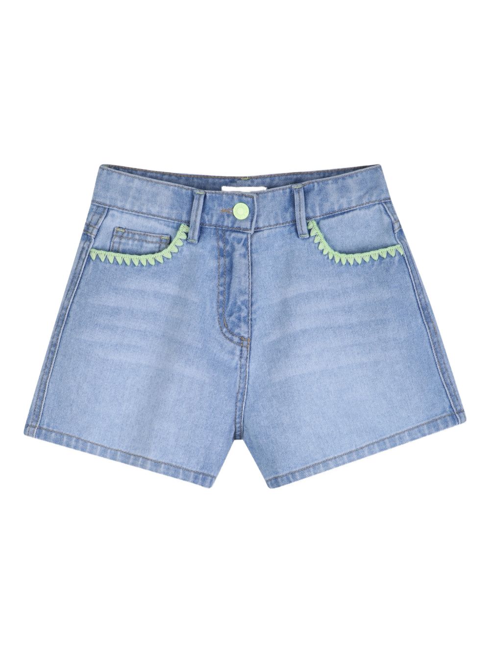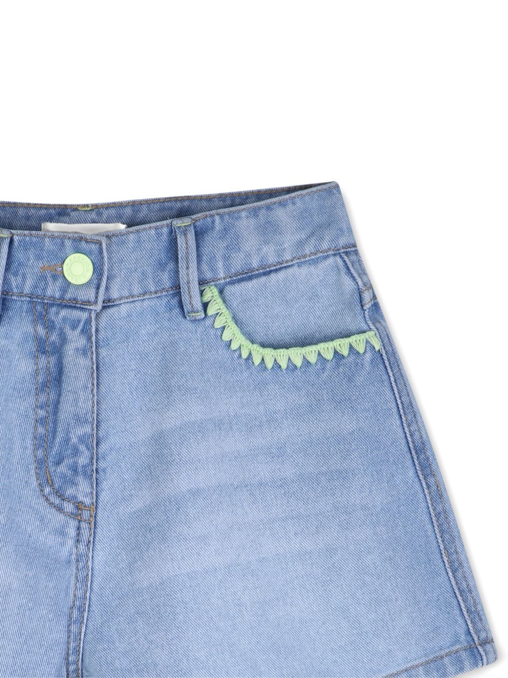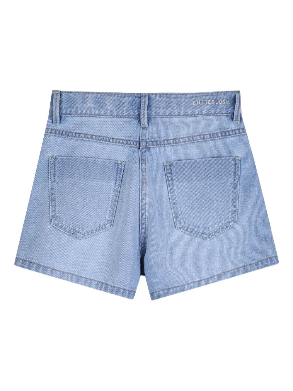 Shorts con tasche rifinite in denim azzurro, chiusura con bottoni, passanti per cintura, tasche posteriori