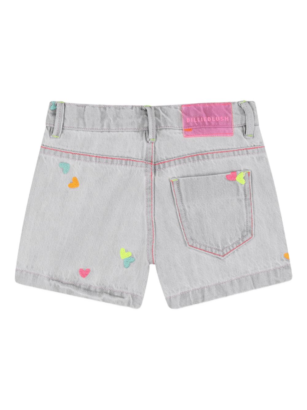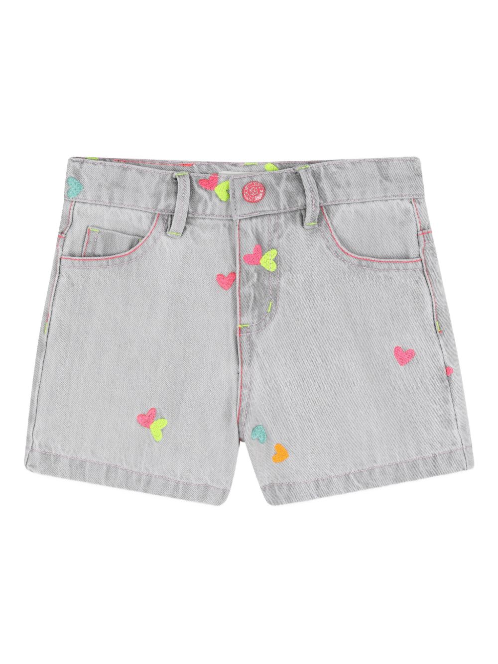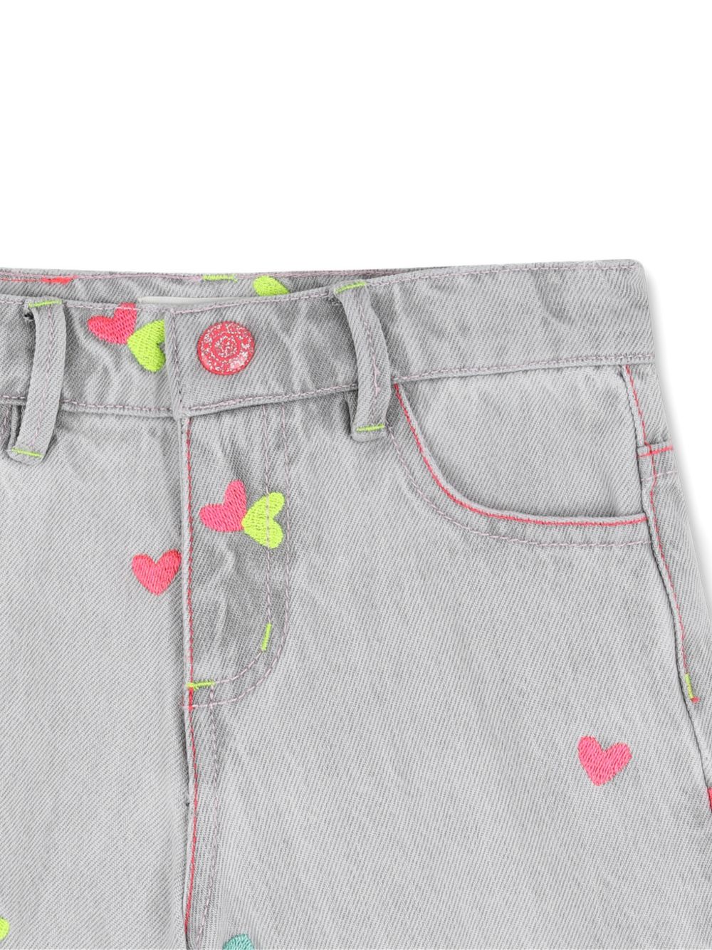 Shorts con motivo a cuore grigio chiaro, cuciture tono su tono, cinque tasche, passanti per cintura, chiusura con bottone e cerniera.
