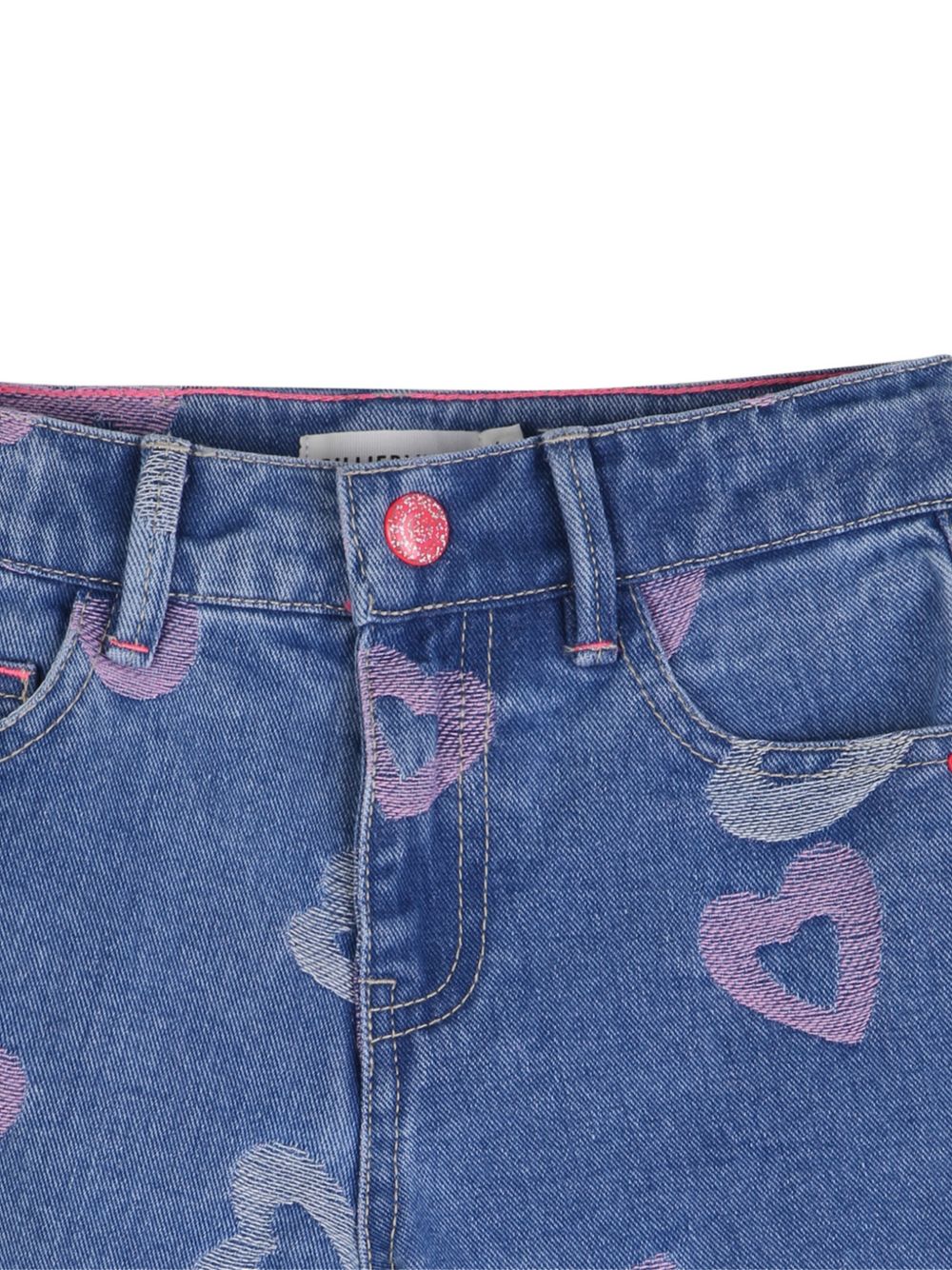 Shorts con chiusura con bottoni e zip con stampa a cuore blu, cinque tasche, passanti per cintura
