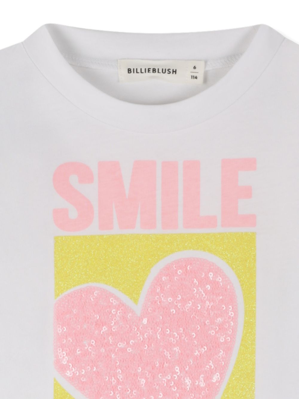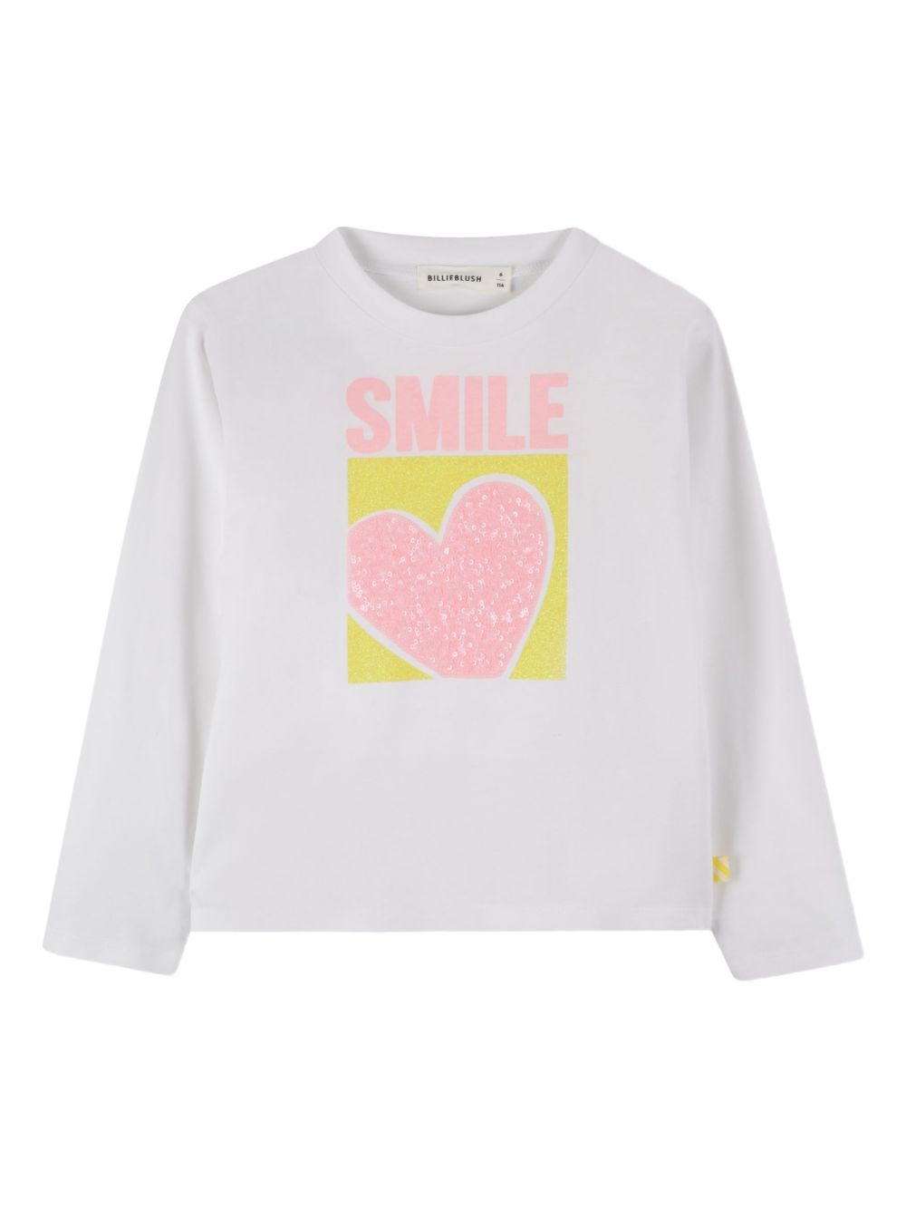 T-shirt bianca, stampa grafica sul davanti cuore con paillettes, girocollo, maniche lunghe.
