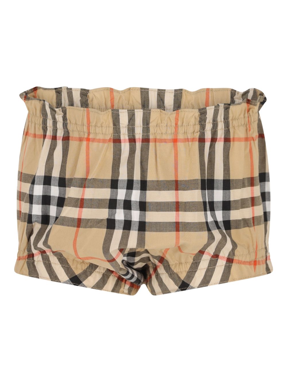 motivo a quadri beige, colletto alla Peter Pan, chiusura con bottoni, maniche corte, gonna plissettata.