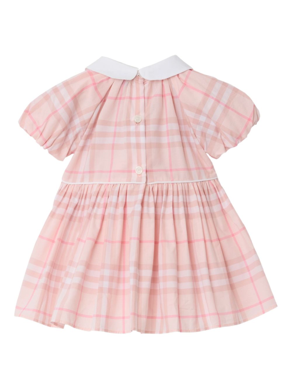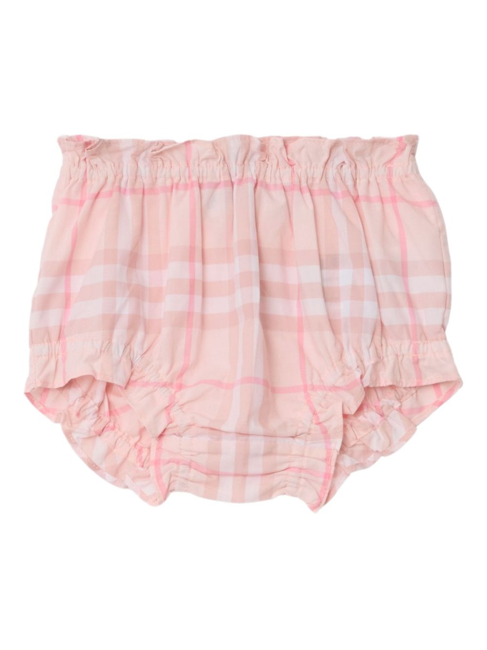 pantaloni a pantaloncino con colletto alla Peter Pan, a quadri rosa, a maniche corte e chiusura con bottoni