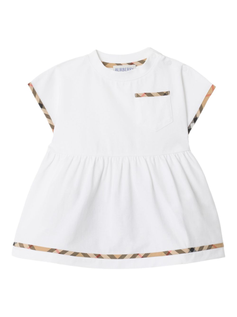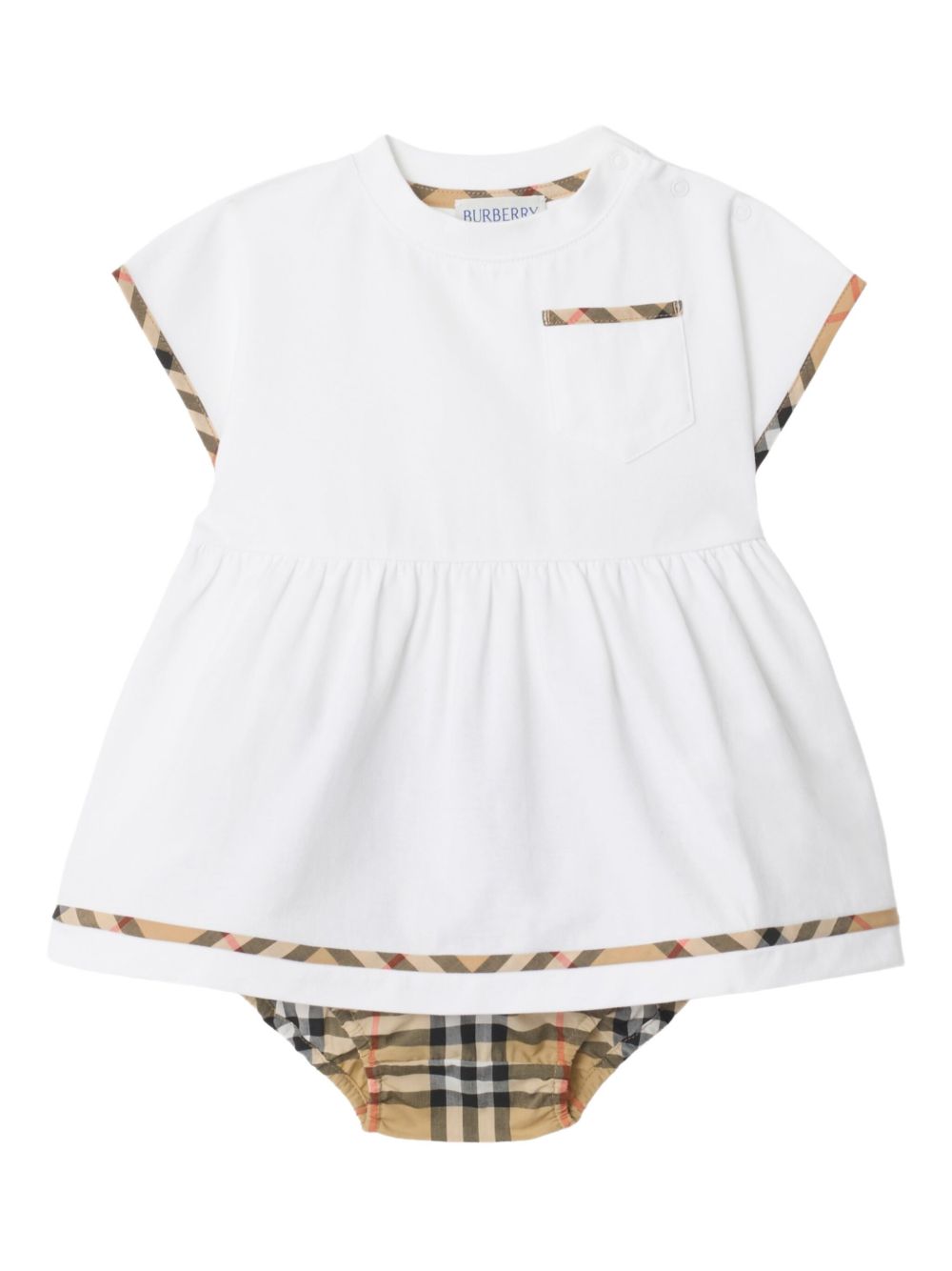 rifiniture a quadri bianchi, tasca applicata sul petto, spalline con bottoni automatici, vita elasticizzata