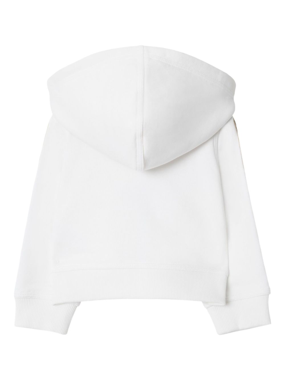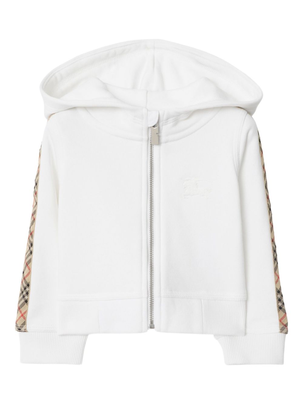 chiusura frontale con zip bianca, cappuccio classico, maniche lunghe, maniche con motivo a quadri