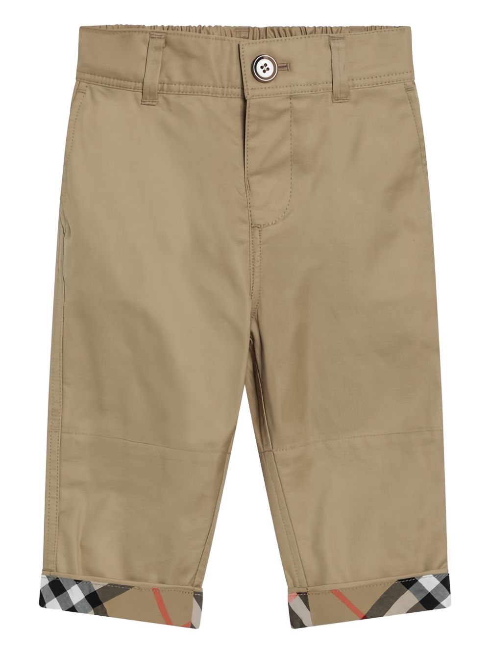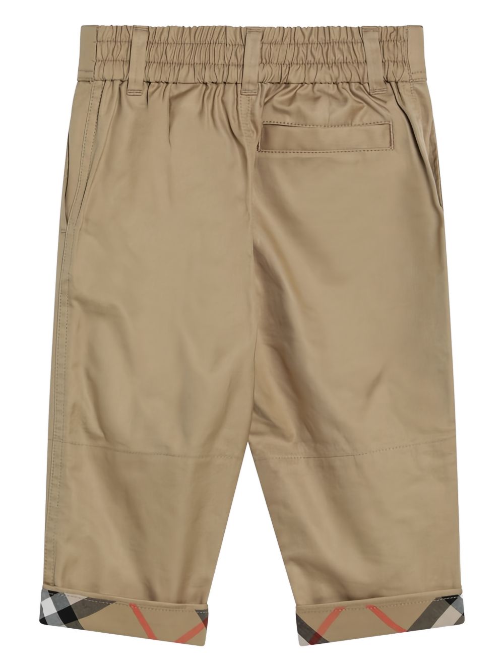 bordo a quadri beige sabbia, vita elasticizzata, chiusura con bottoni, tasca posteriore, passanti per cintura