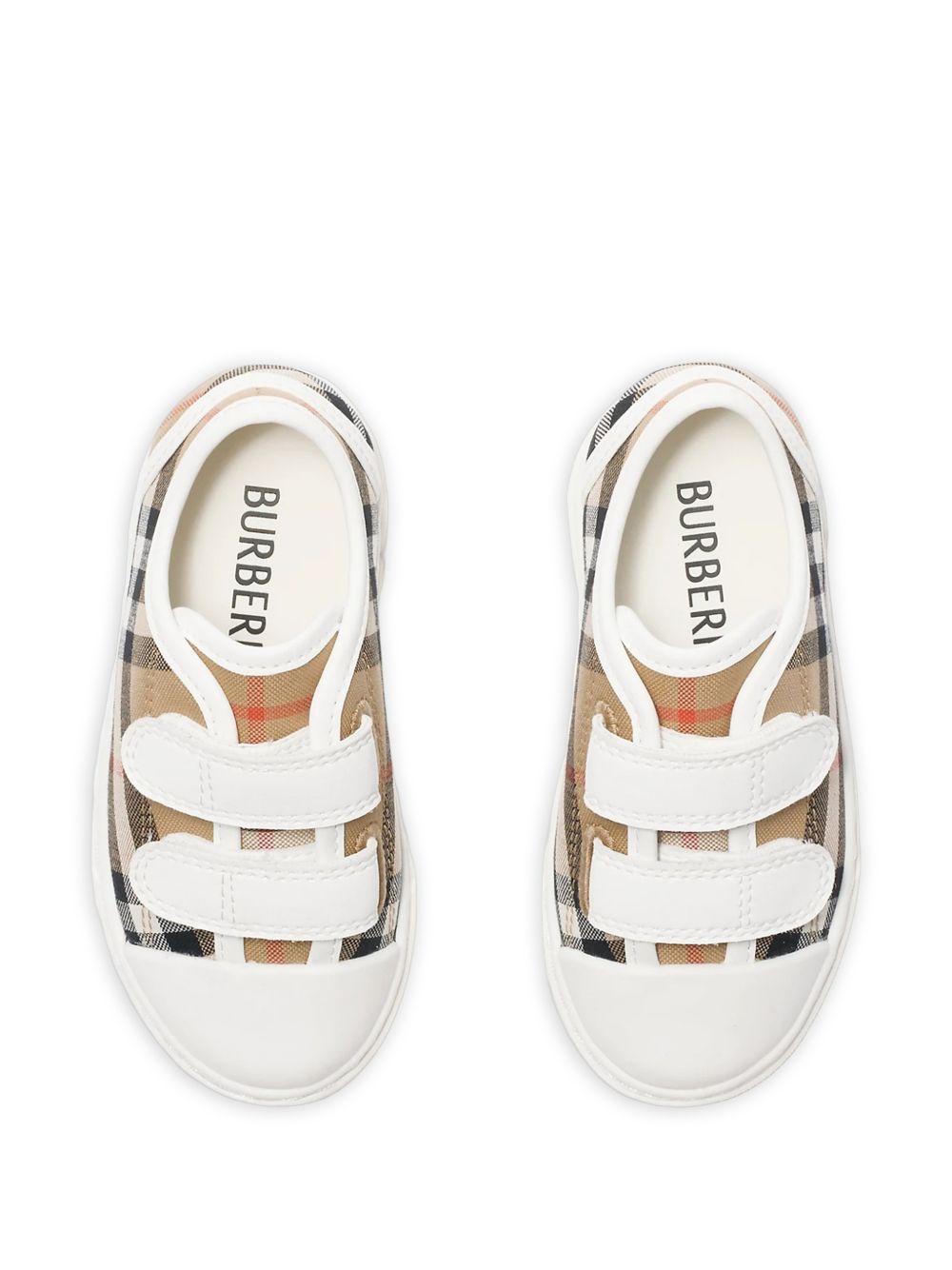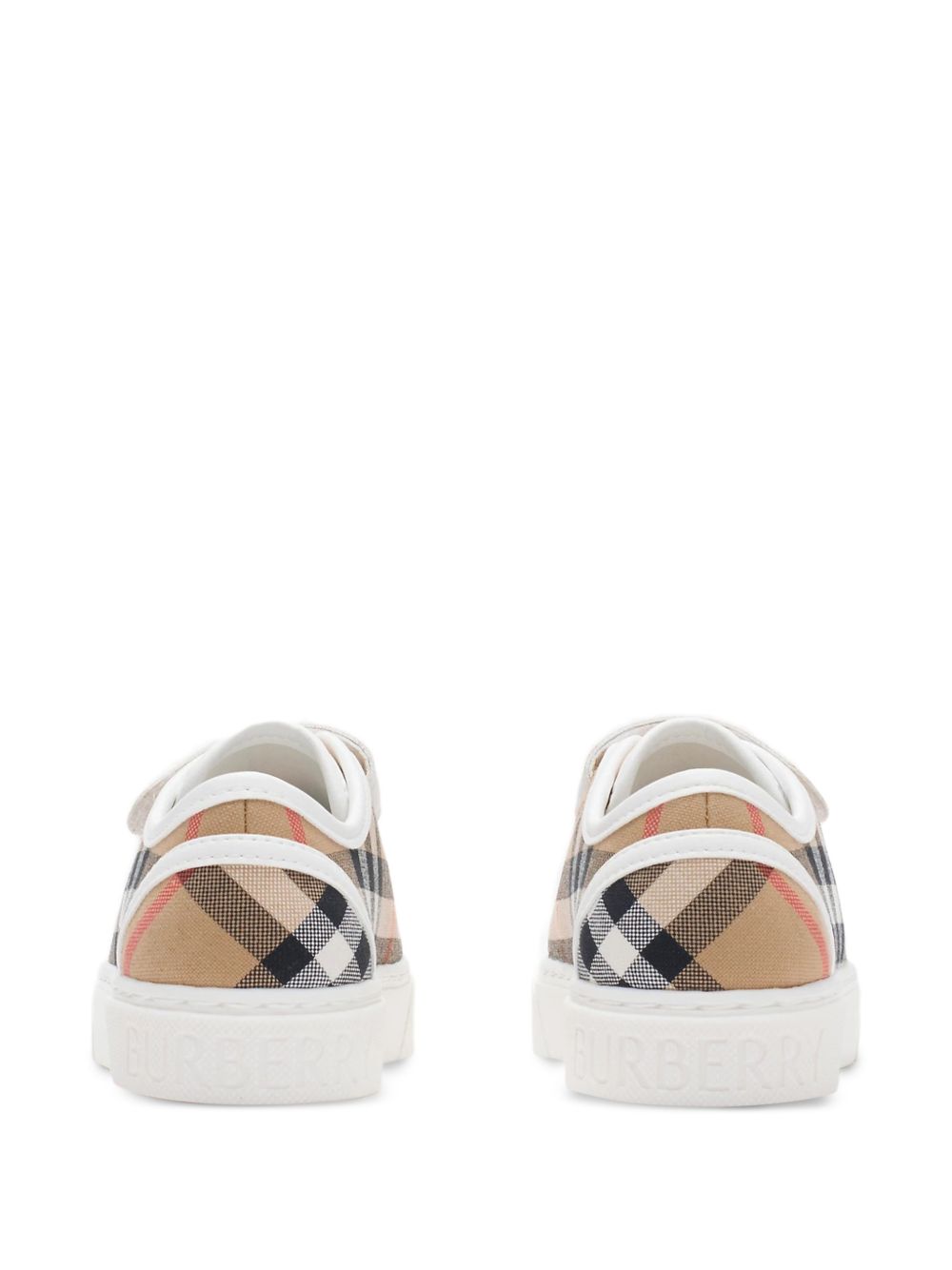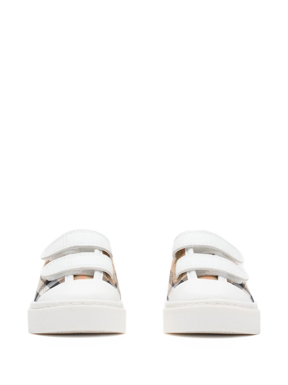 modello a quadri beige e multicolore, chiusura con cinturino, punta tonda, suola a contrasto