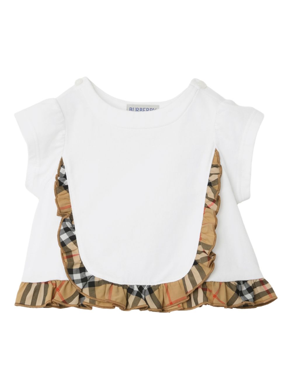motivo a quadri bianchi, bordi arricciati, girocollo, maniche a pipistrello, abbottonatura sulle spalle