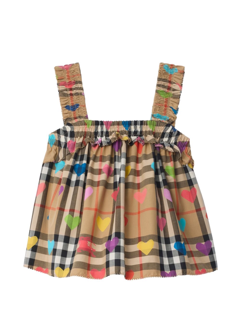 Un top in morbido cotone, stampato con il caratteristico motivo Burberry Check color sabbia e decorato con una fantasia di cuori arcobaleno. La silhouette leggera è ideale per le giornate calde e presenta delicate pieghe e bordi a picot. Stampa di cuori beige