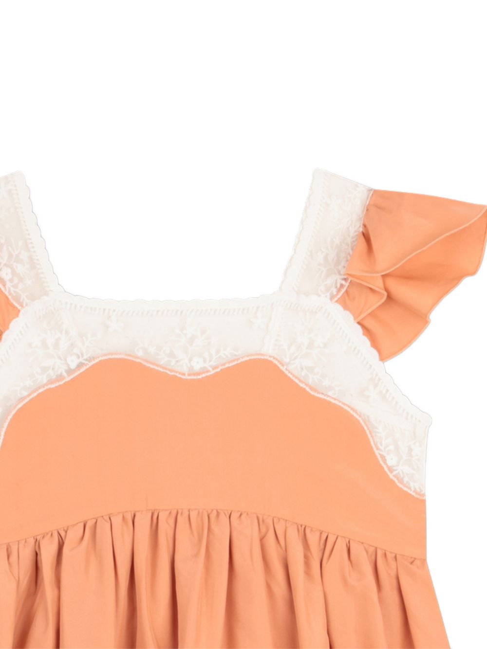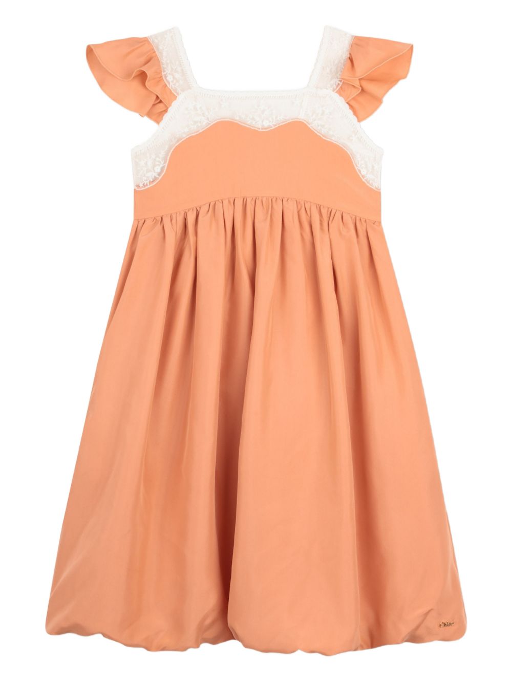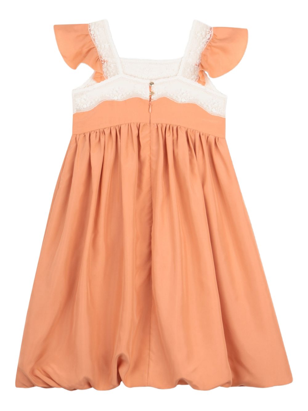 Abito con maniche arricciate in pizzo color corallo arancione, chiusura posteriore con cerniera