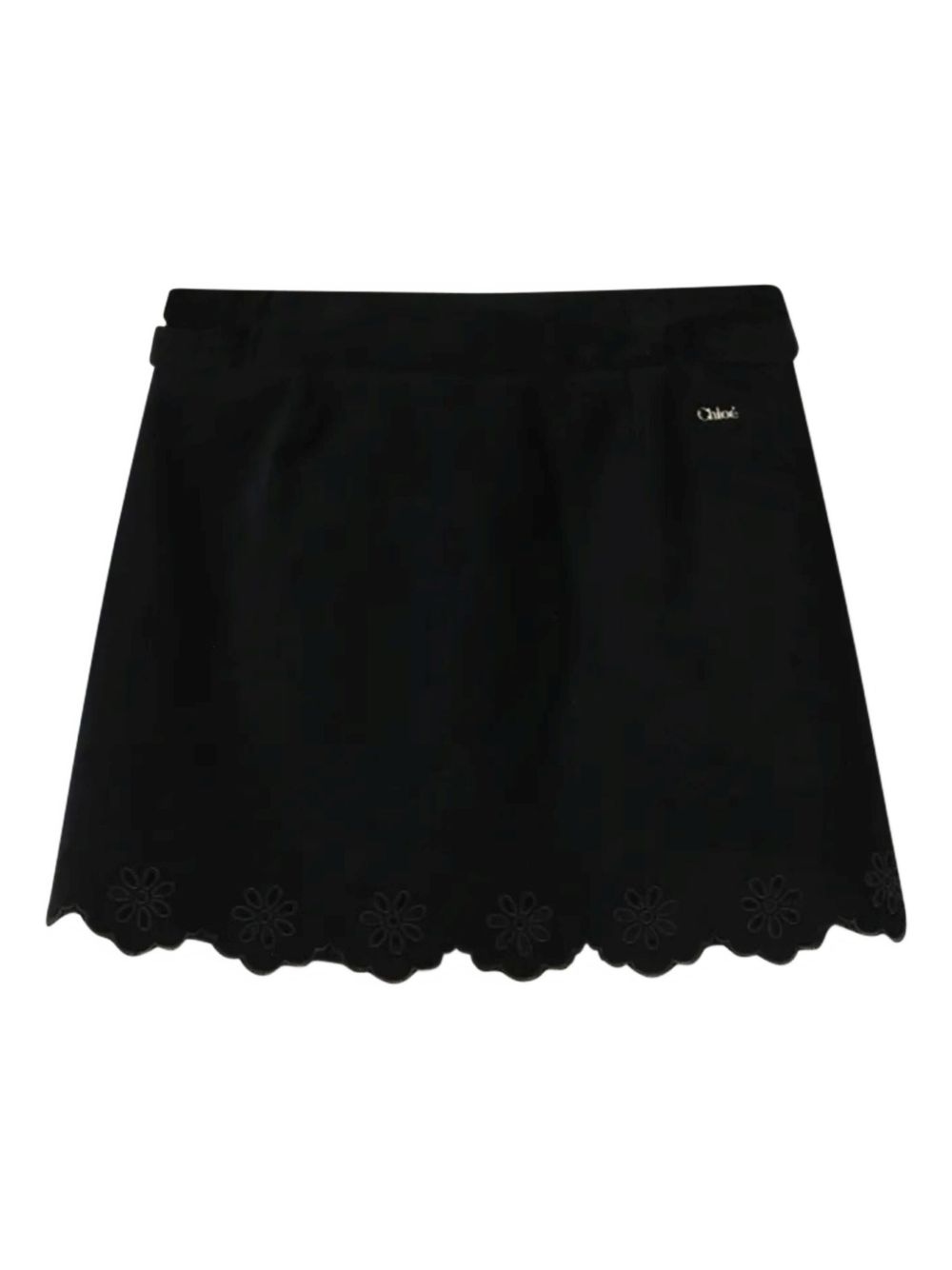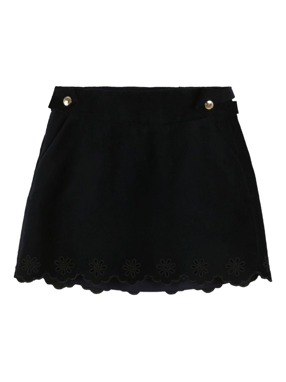 Gonna blu navy, ricamo a fiori, orlo smerlato,tasche laterali, bottoni color oro.