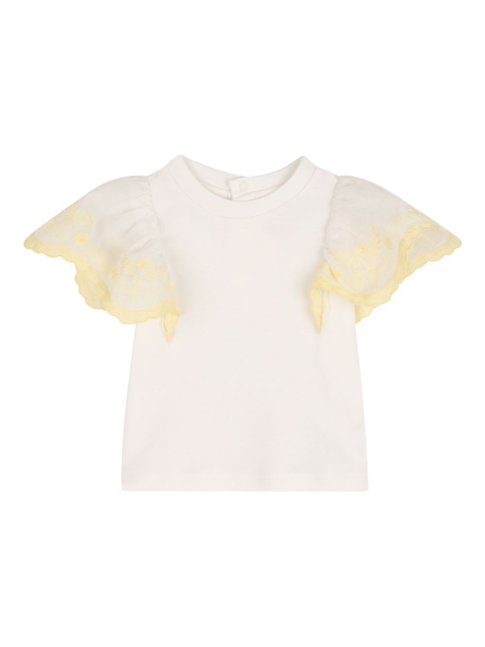 Top con maniche arricciate con bordo in pizzo bianco, scollo rotondo, chiusura con bottoni sul retro