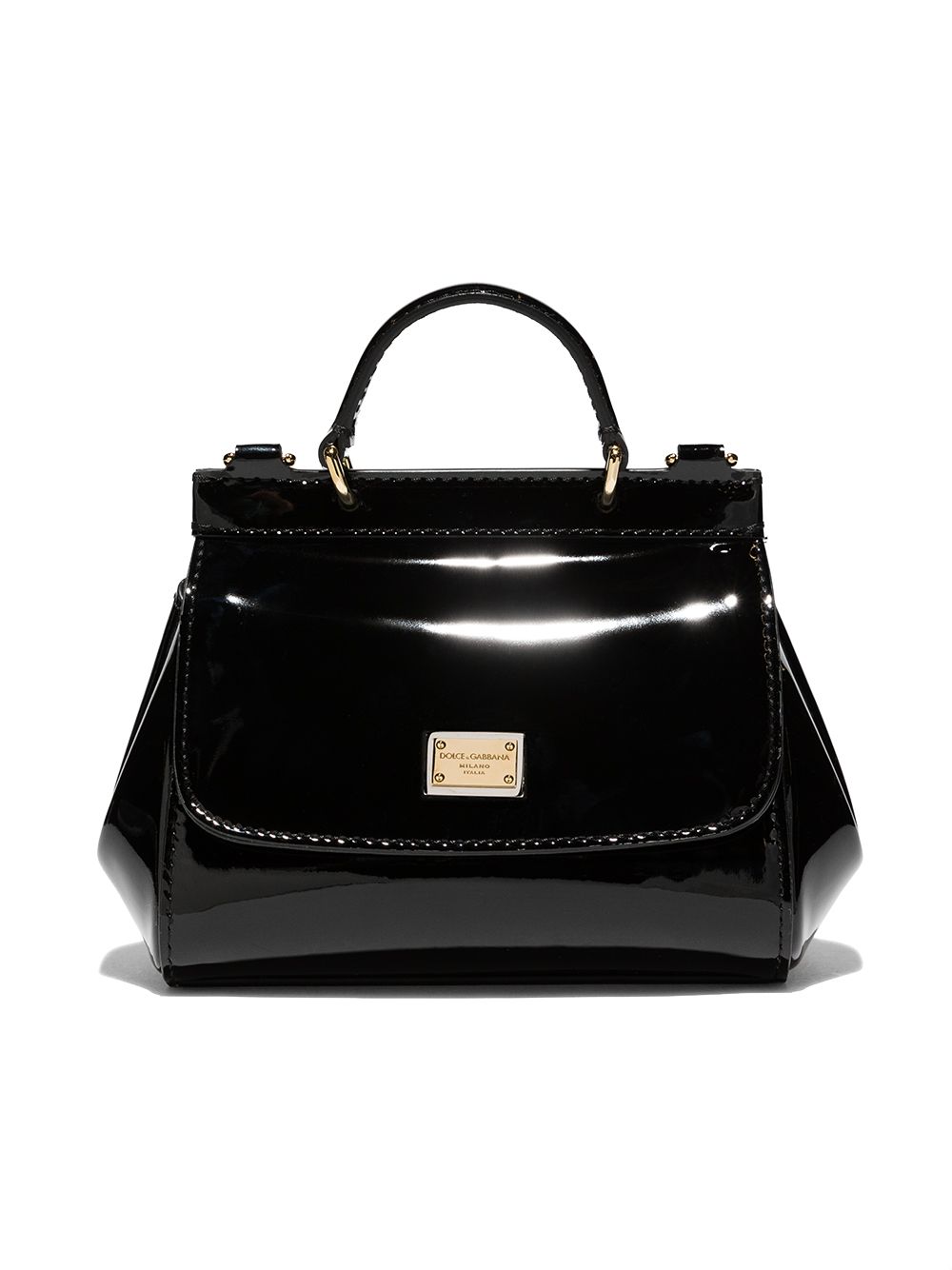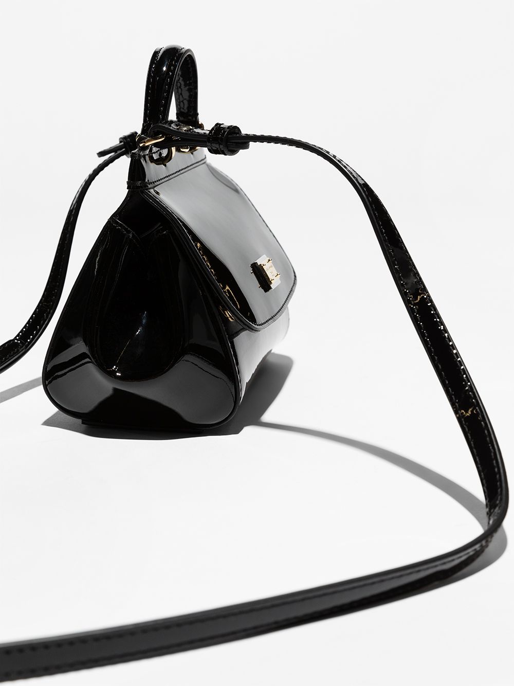 Manico singolo piatto in pelle nera, placca con logo, tracolla regolabile, dettagli in metallo color oro, chiusura magnetica a scomparsa, scomparto principale