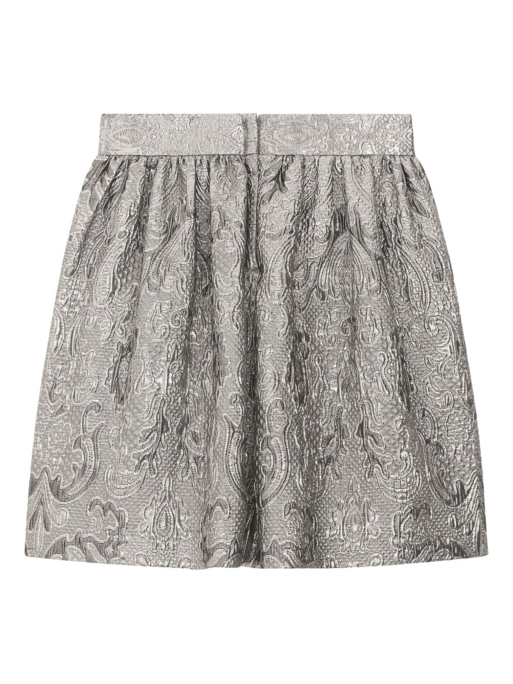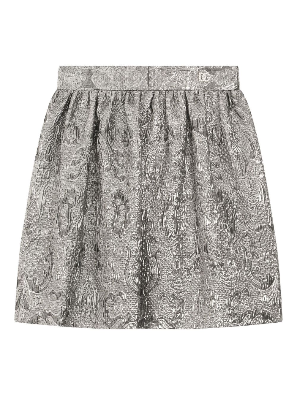 Gonna damascata, lamè argento, con logo mettalico in swarosky