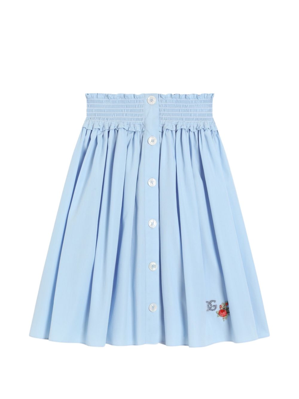 cintura blu arricciata con chiusura a bottoni e logo, modello a trapezio
