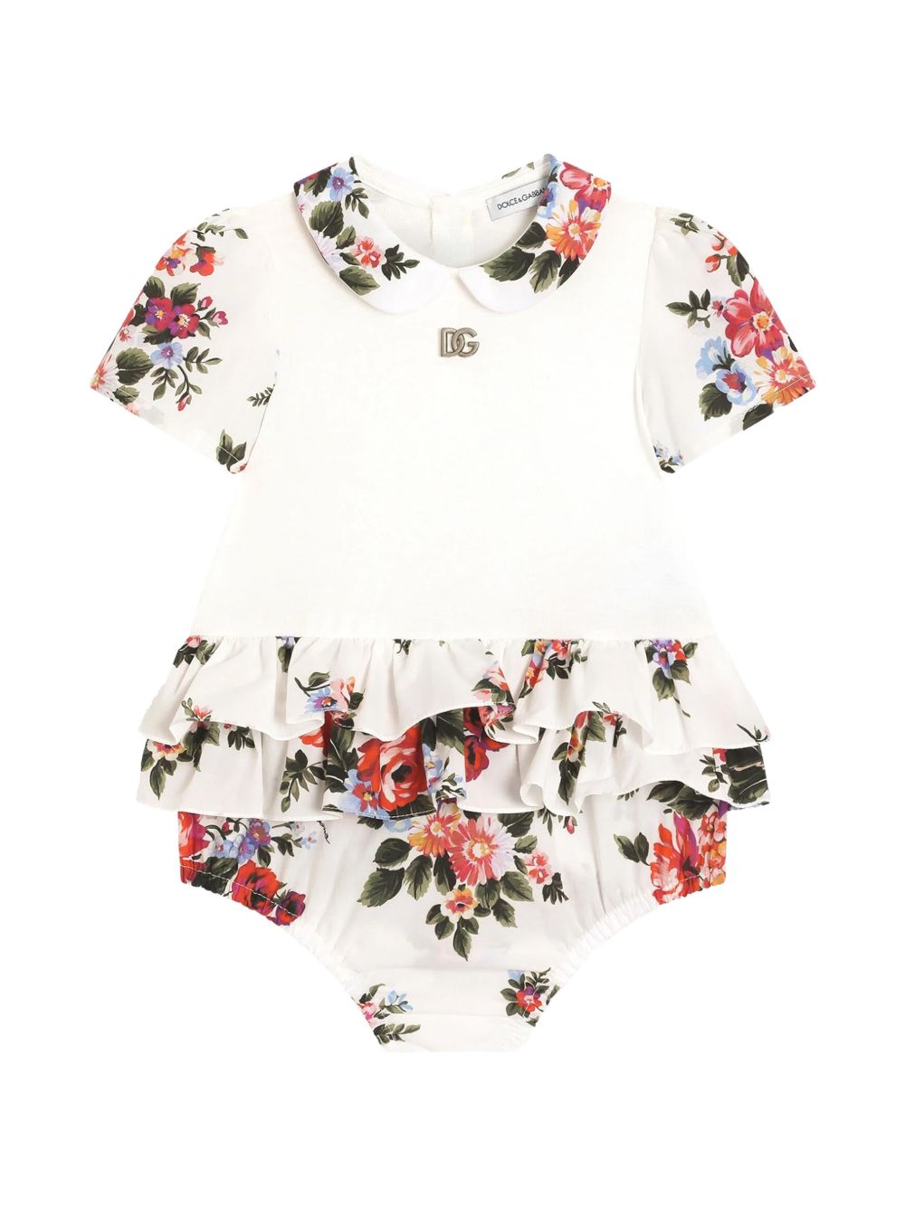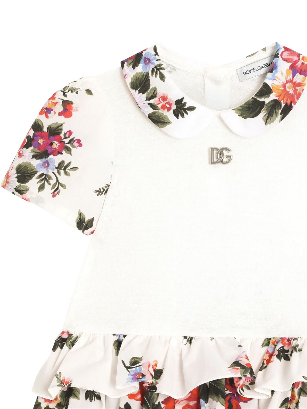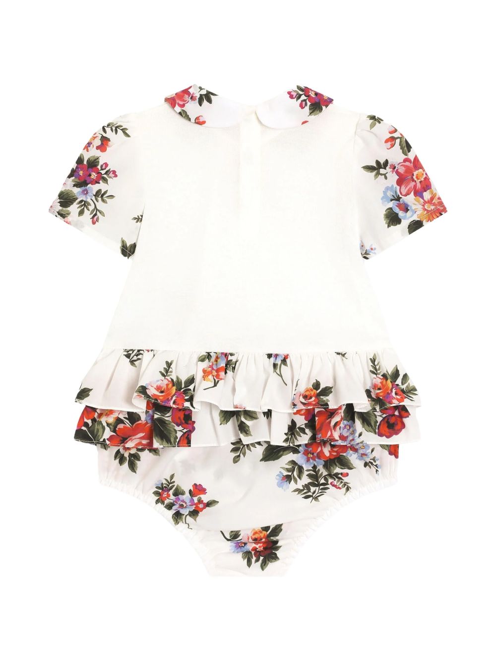 slip a maniche corte con stampa floreale bianca, colletto Peter Pan e volant a strati