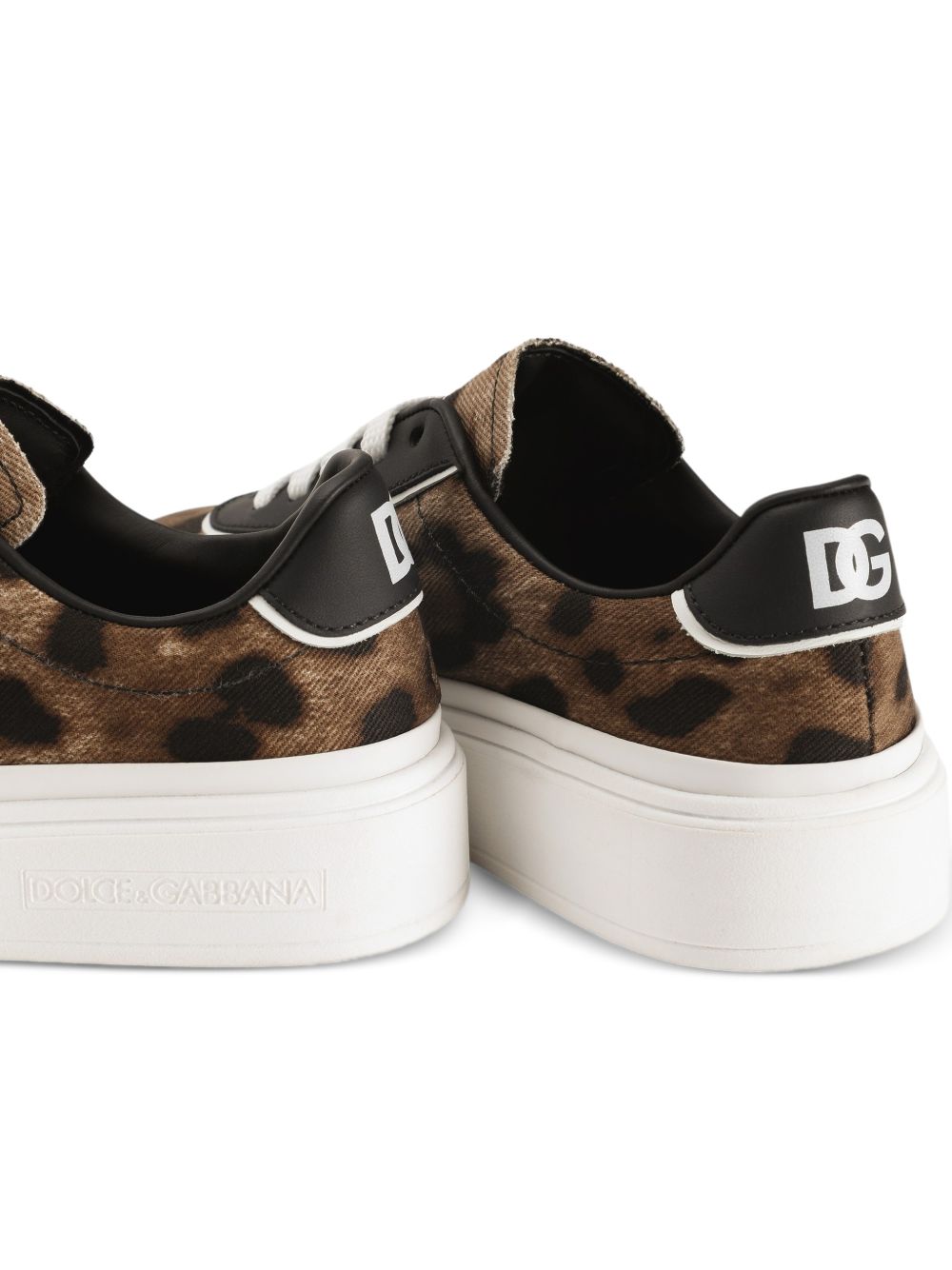 Sneakers con logo con stampa leopardata marrone e nera, suola con plateau, punta tonda, chiusura frontale con lacci, finiture in pelle.