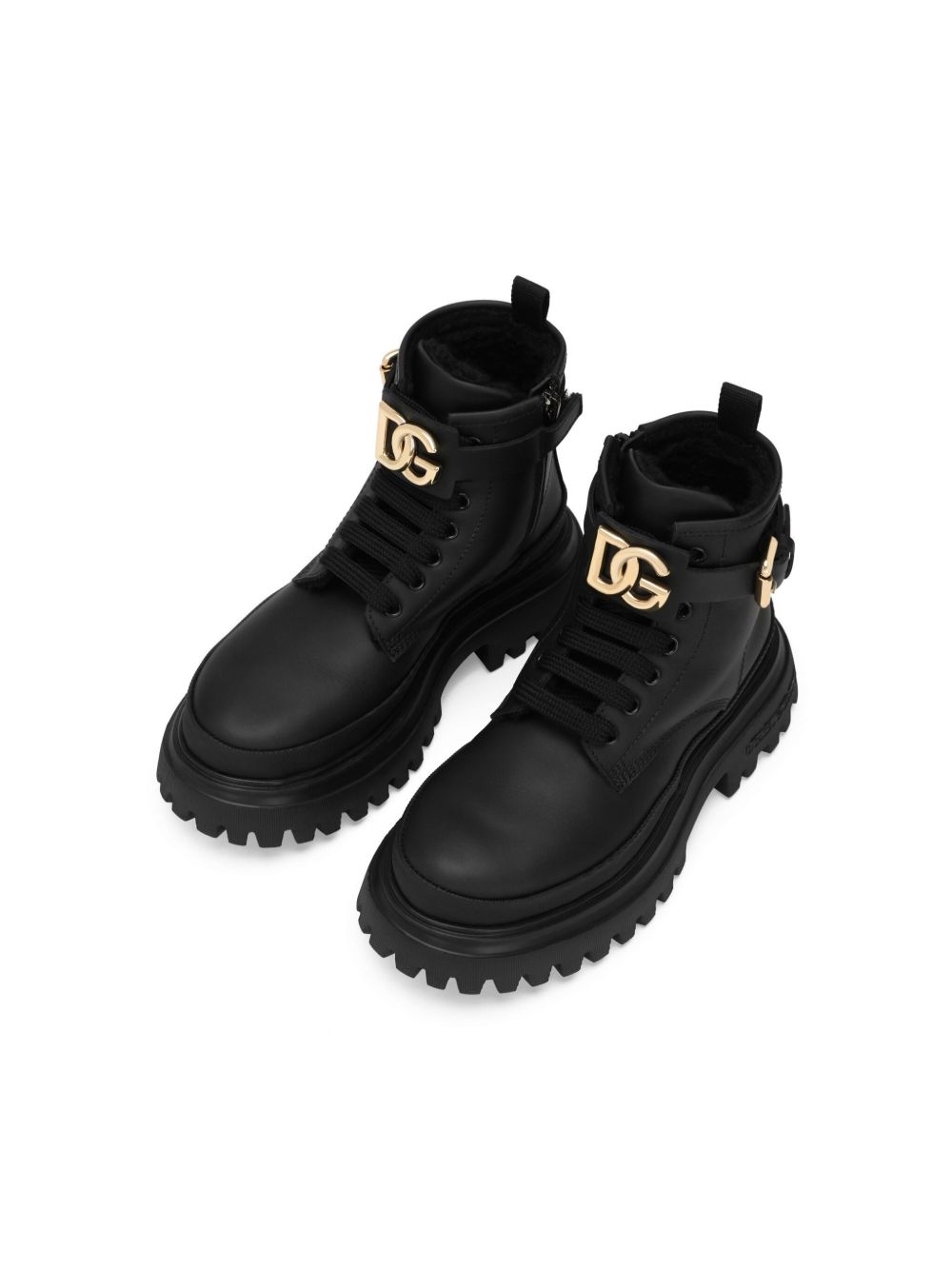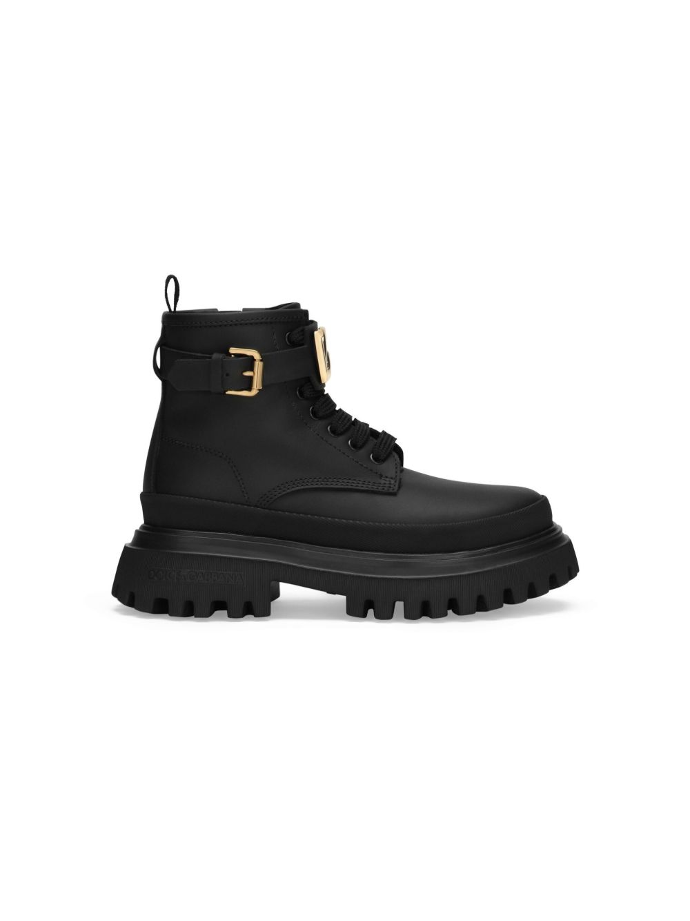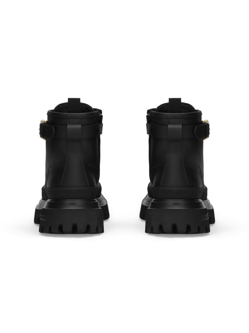 pelle di vitello nera, grana liscia, applicazioni in metallo color oro, logo, linguetta sul tallone, punta tonda, chiusura frontale con lacci, chiusura laterale con zip, cinturino alla caviglia con fibbia, lunghezza alla caviglia, suola in gomma rigata.
