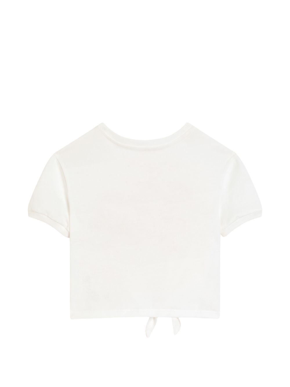 T-shirt bianco,dettaglio nodo, scollo tondo, maniche corte, dettaglio decorato