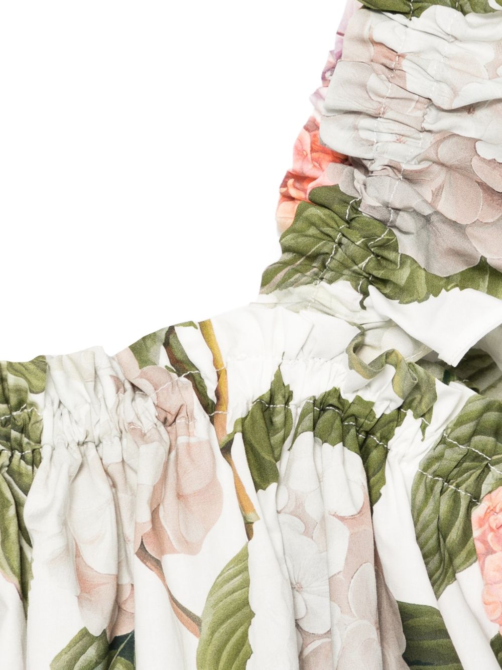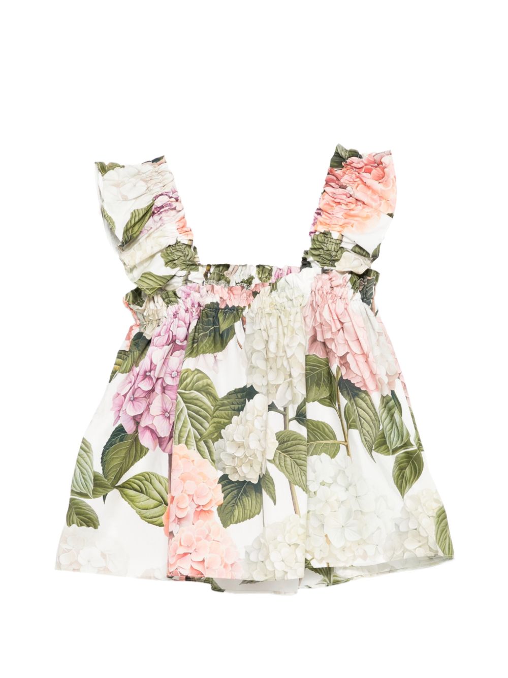 stampa floreale bianca e verde, scollo quadrato, bordi arricciati, maniche corte