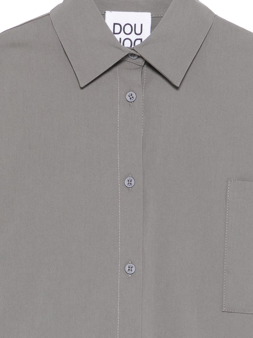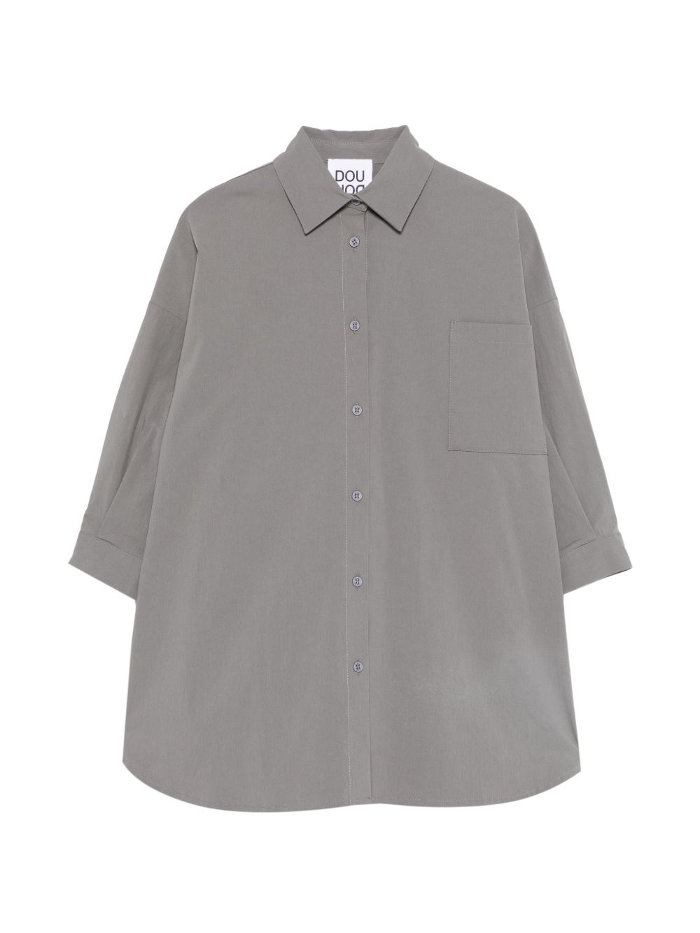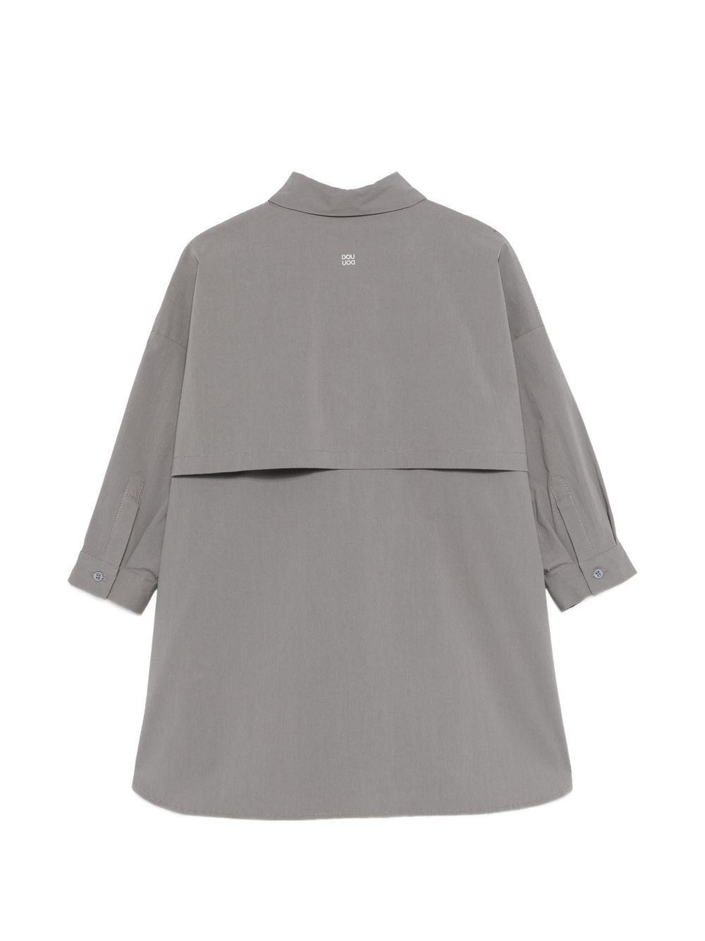 Abito grigio con colletto a punta, chiusura con bottoni, tasca sul petto, maniche a tre quarti, carrè posteriore.