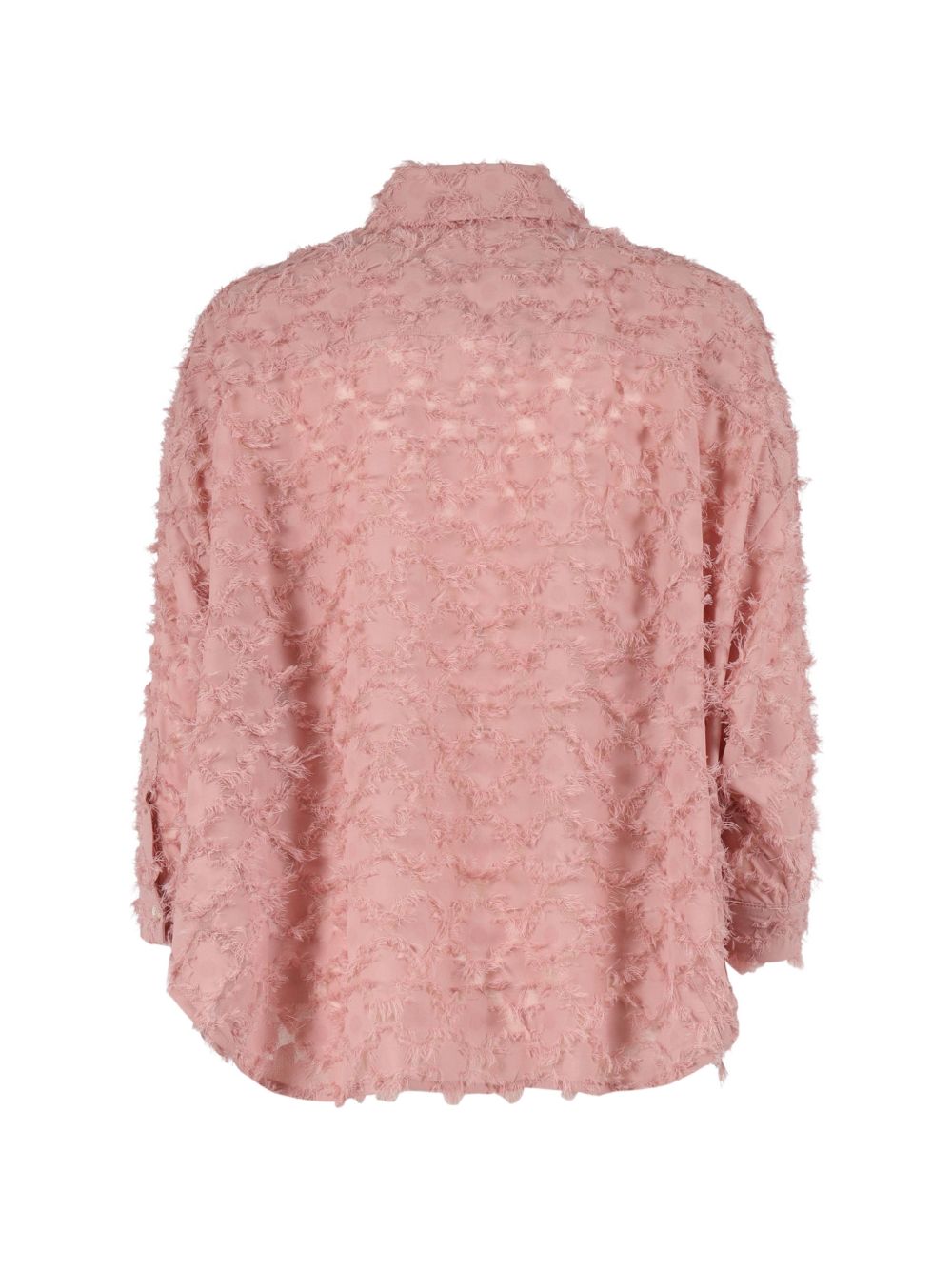 Camicia rosa pastello, design sfrangiato, chiusura a bottoni, colletto a punta, maniche lunghe, orlo dritto.