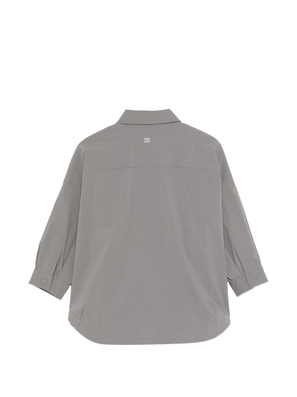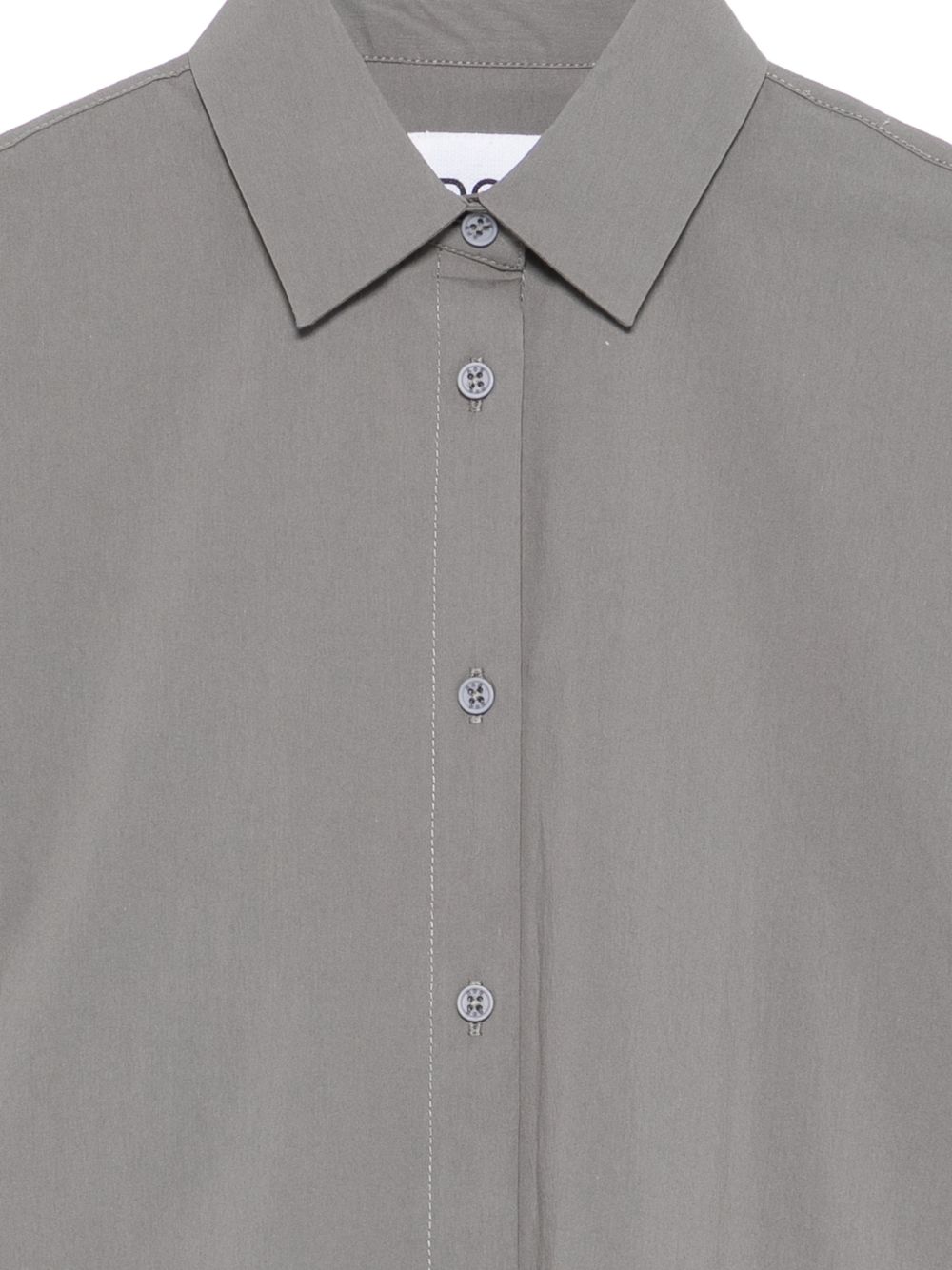 Camicia grigia, chiusura con bottoni bianchi, colletto classico, maniche a tre quarti, orlo curvo.