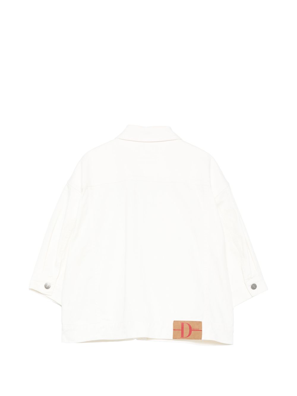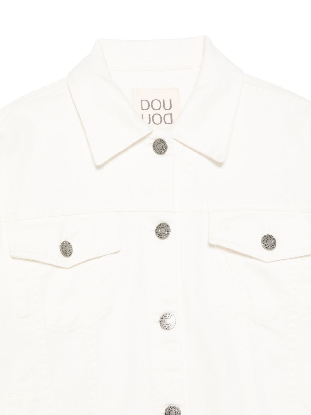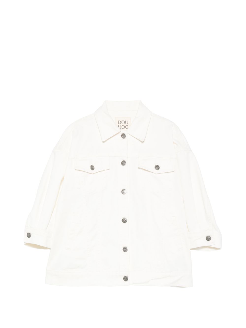 Giacca con tasche sul petto ,bianca, chiusura con bottoni, maniche a tre quarti.
