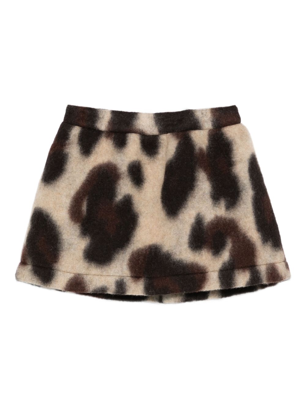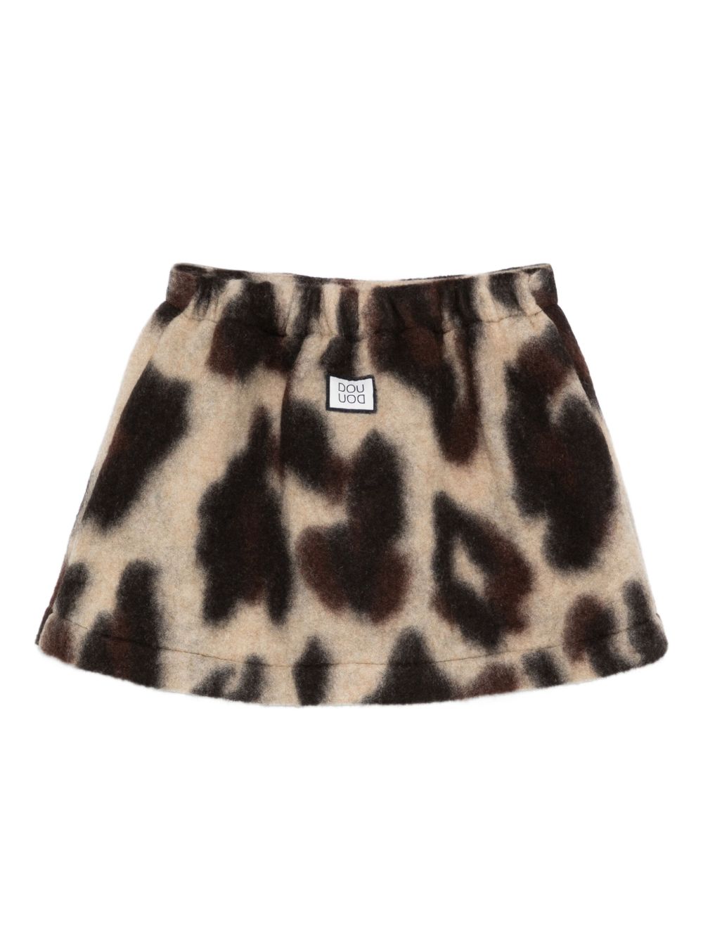 Gonna marrone, vita elasticizata, stampa animalier, design trapezio.