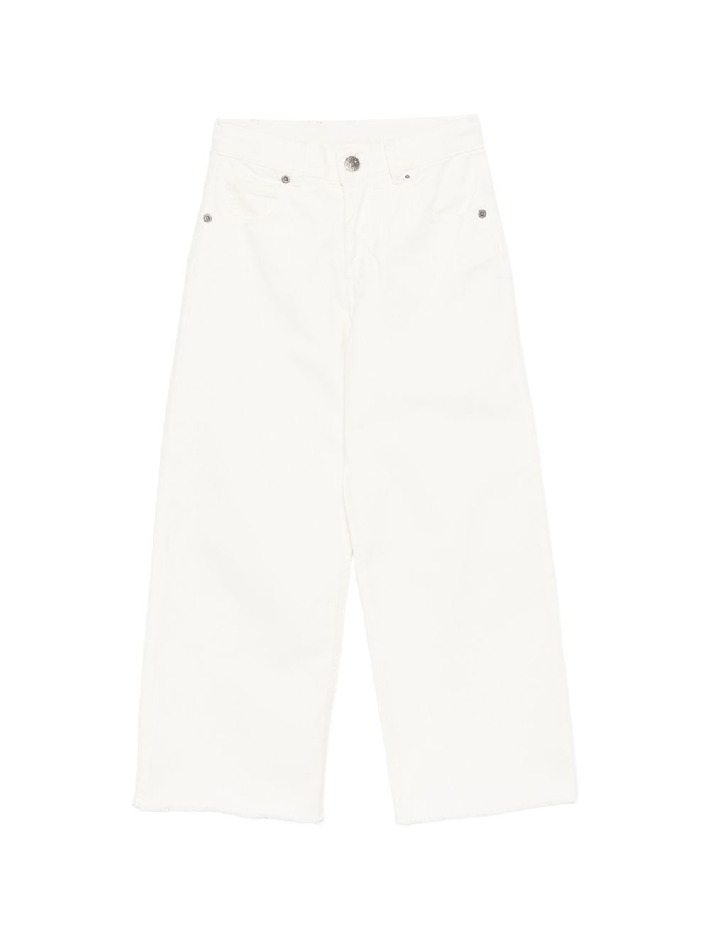 Pantalone bianco, orlo sfrangiato, chiusura a bottini, passanti, applicazione con logo.