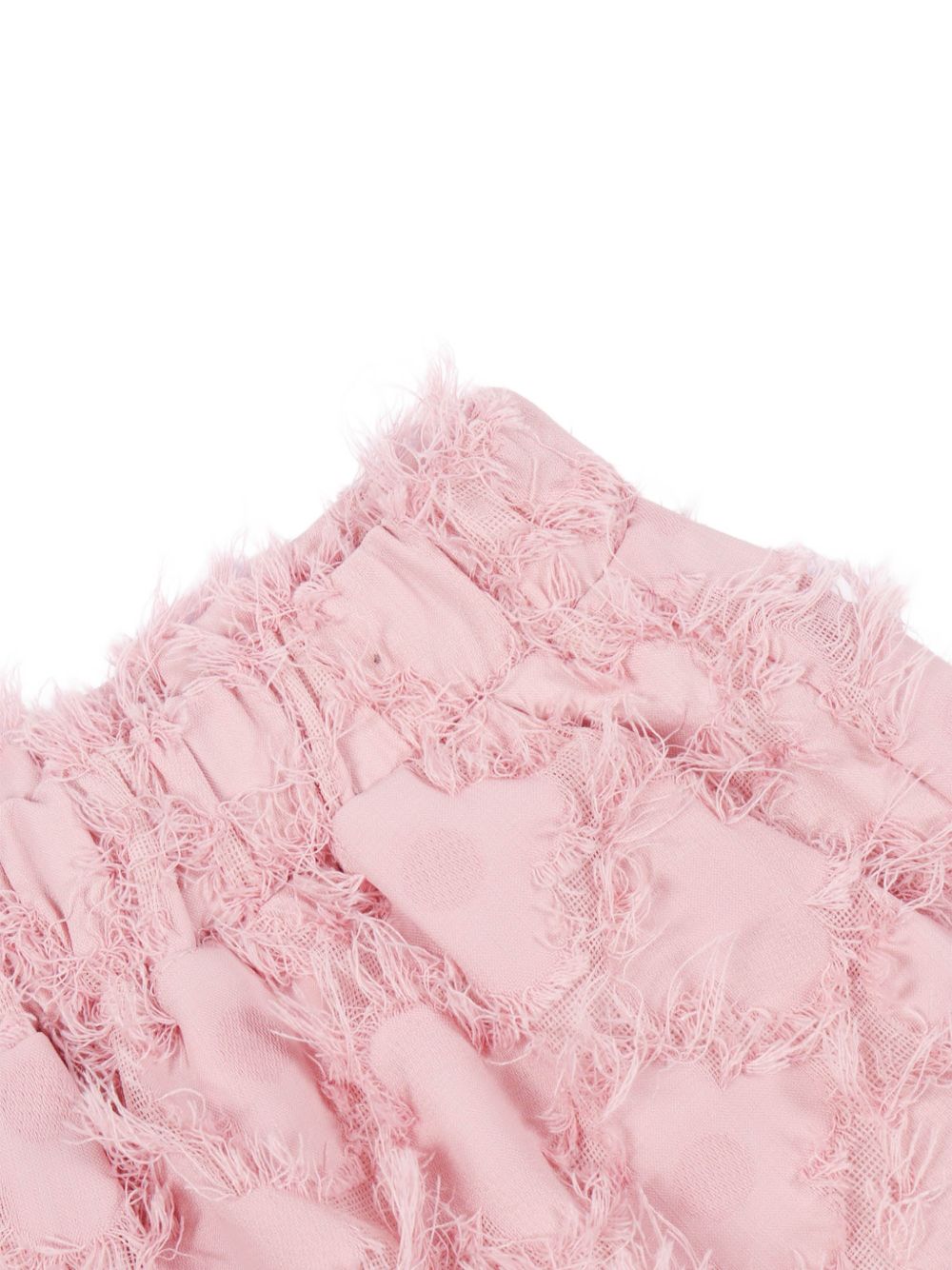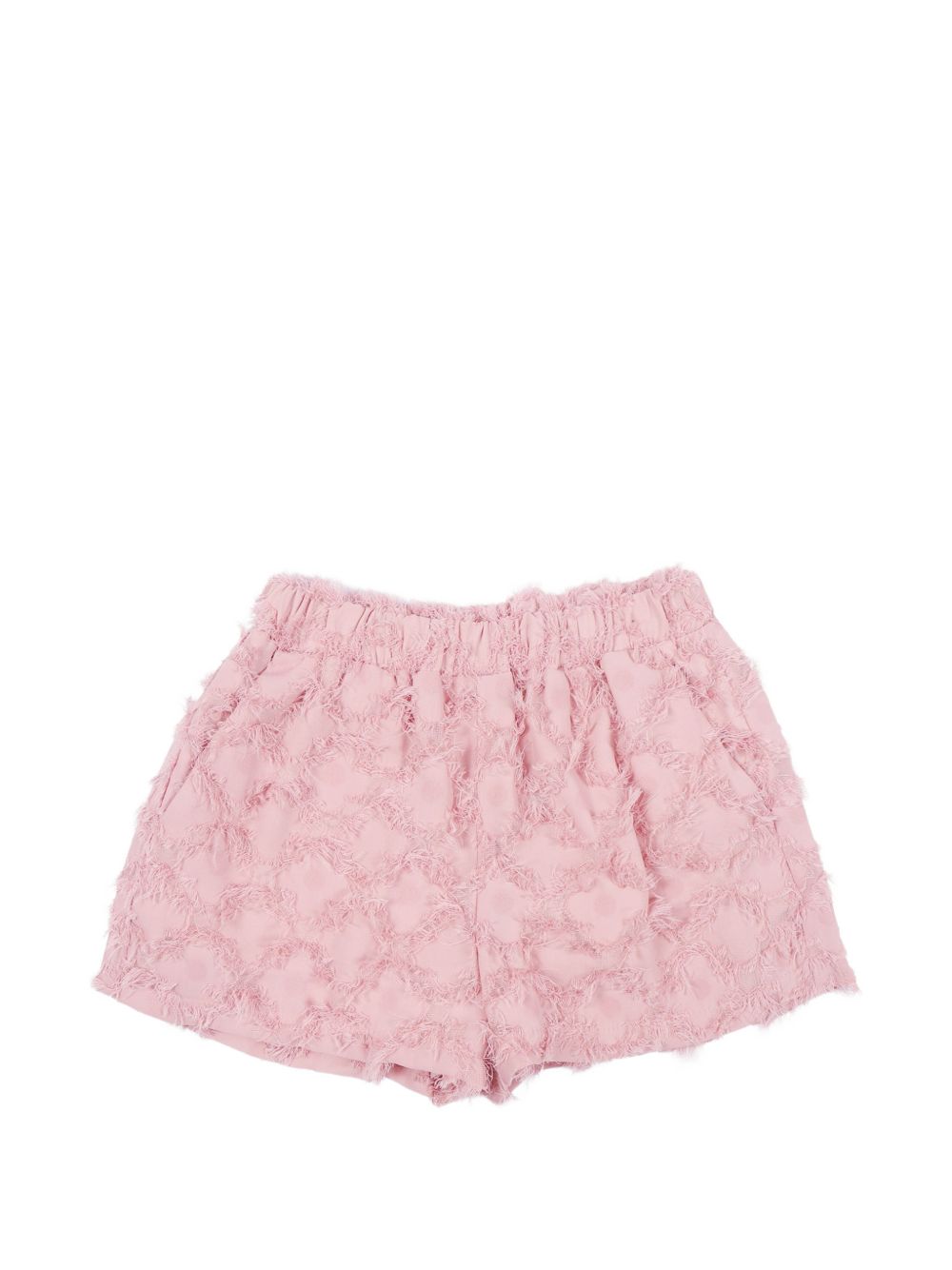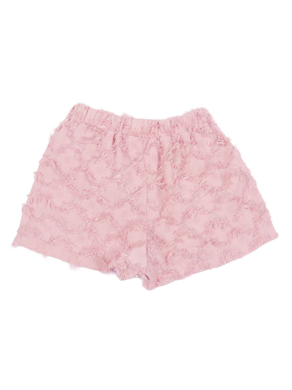 Shorts rosa effetto fil-coupé, dettagli sfrangiati, elastico in vita, due tasche laterali a fessura, orlo dritto