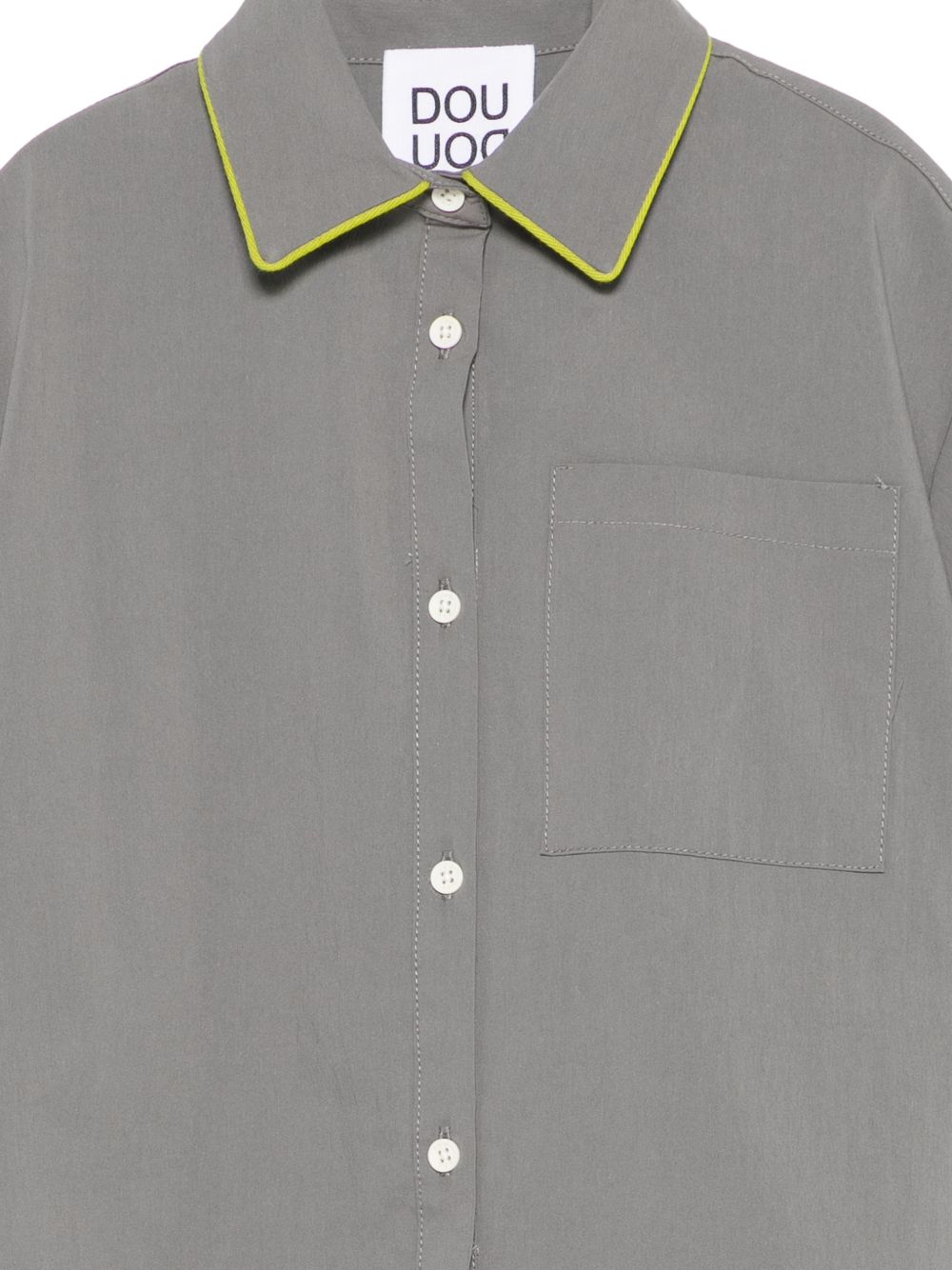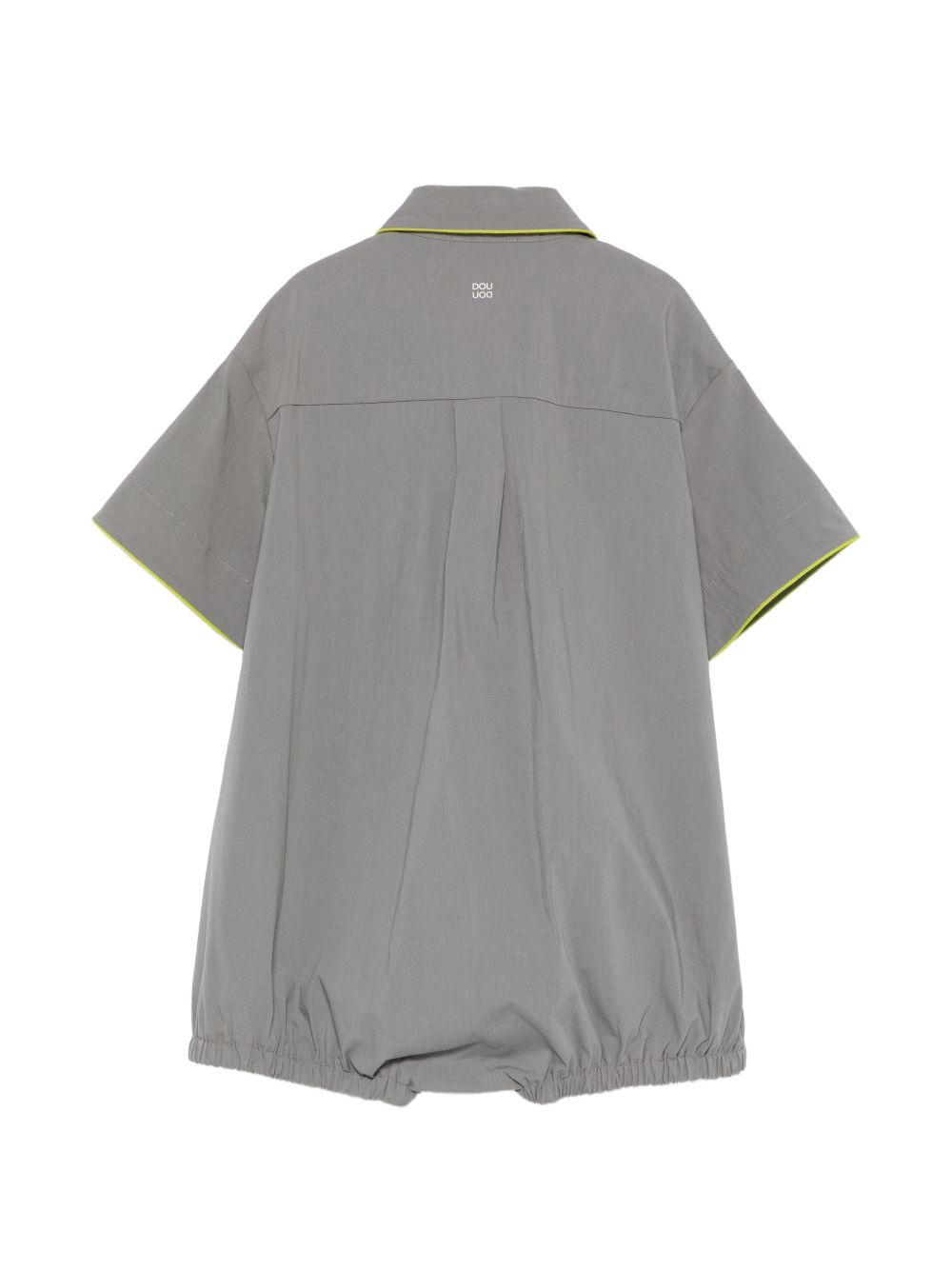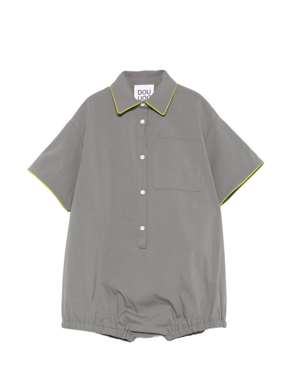 Tuta intera grigia, chiusura con bottoni, orli elasticizzati, tasca sul petto, maniche corte.