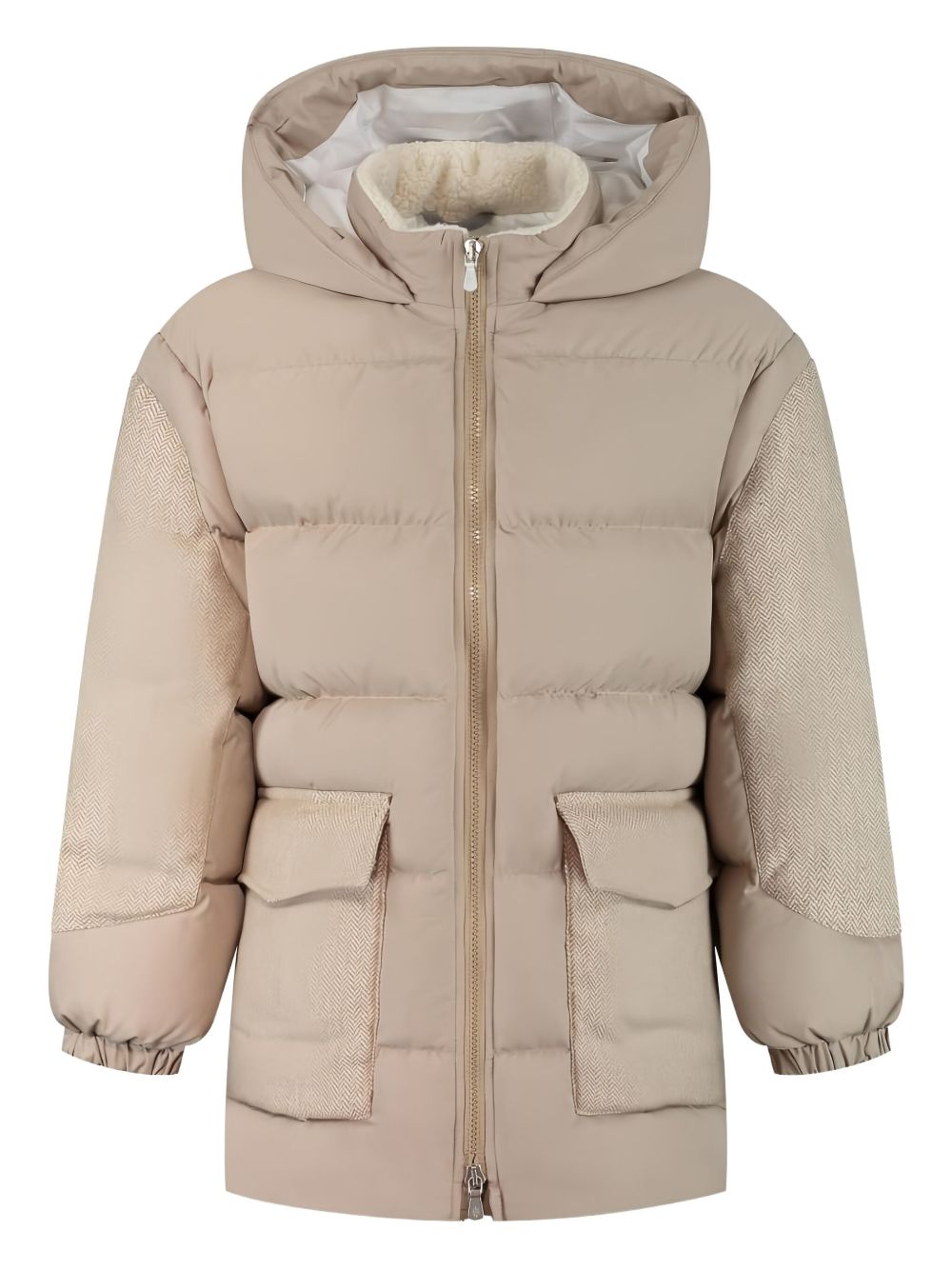 Giubbotto beige con motivo a spina di pesce, cappuccio, chiusura con zip, tasche anteriori, design trapuntato