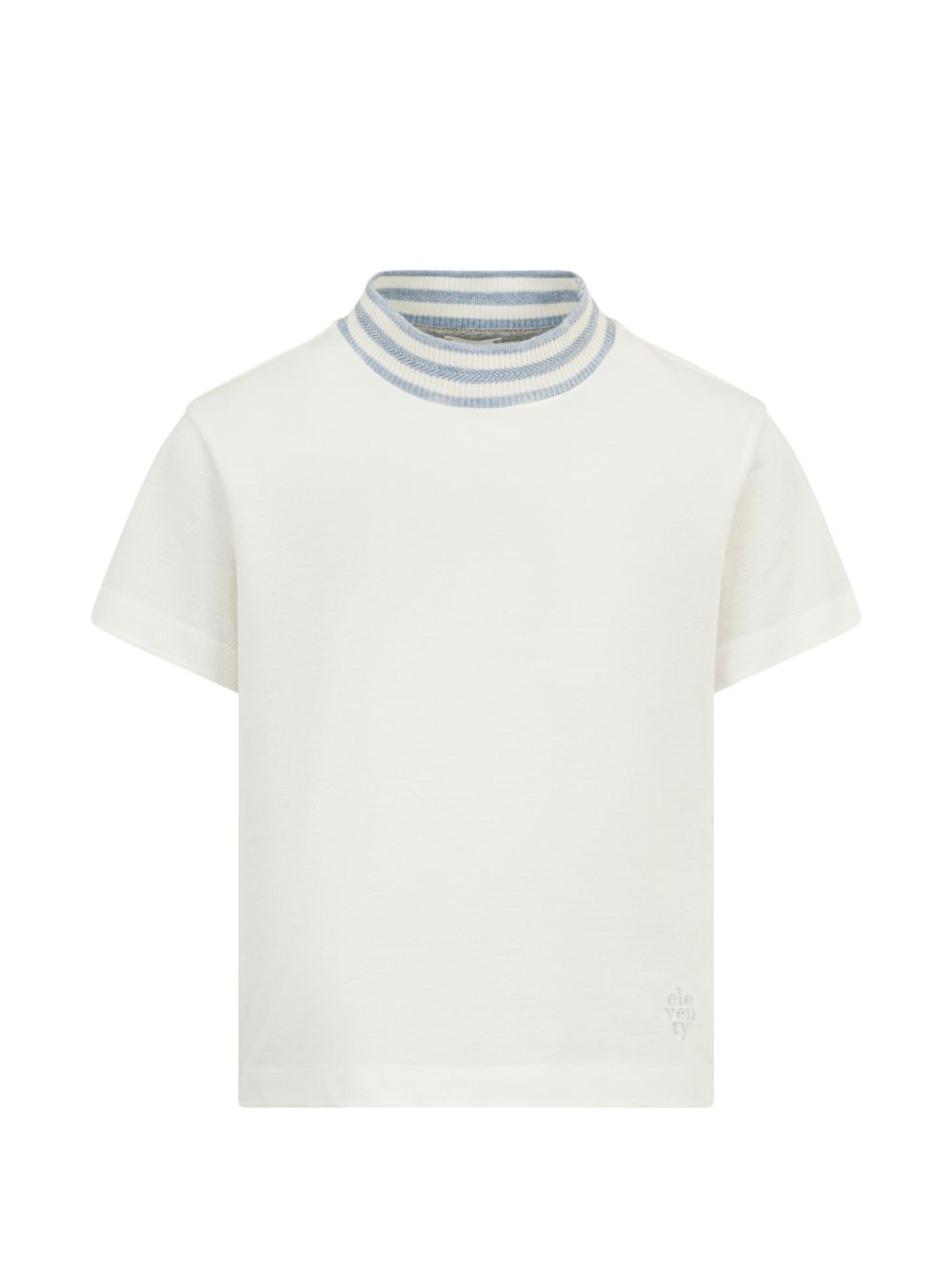 Polo bianco, dettaglio a righe, collo a imbuto, maniche corte, orlo dritto.