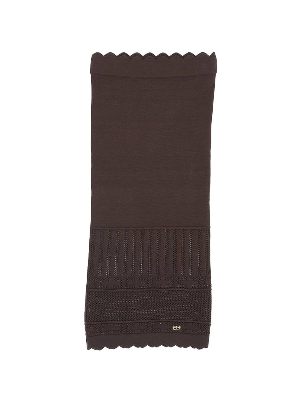Gonna marrone in maglia, orlo a smerlo, dettaglio a coste, placca con logo