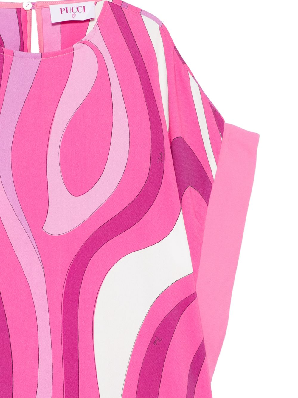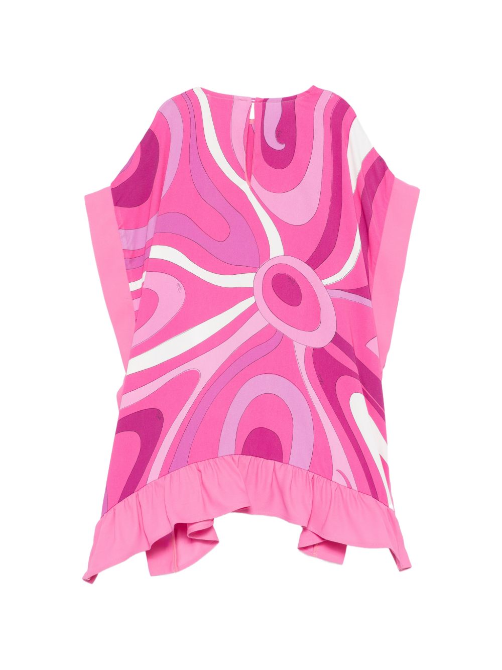 Abito rosa, stampa grafica, con ruches, maniche corte, girocollo, apertura a goccia posteriore