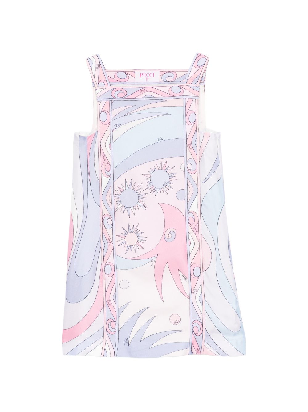 Abito con fantasia grafica rosa chiaro, scollo quadrato, senza maniche.