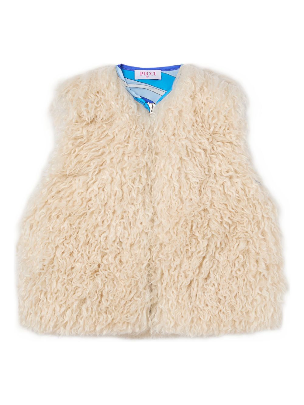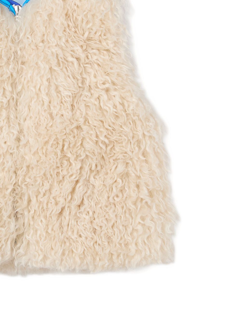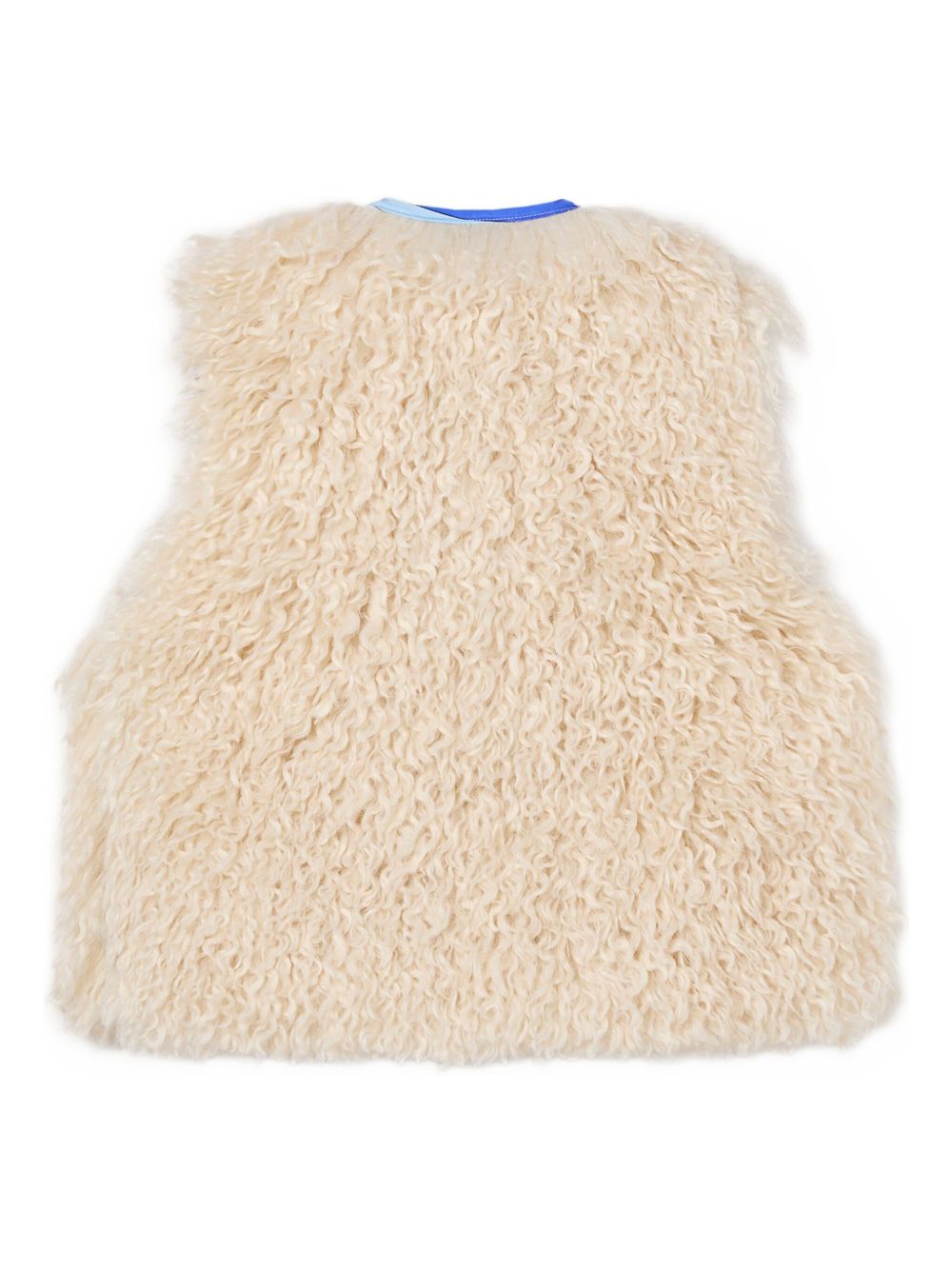 modello in pelliccia sintetica color crema senza maniche e scollo a V