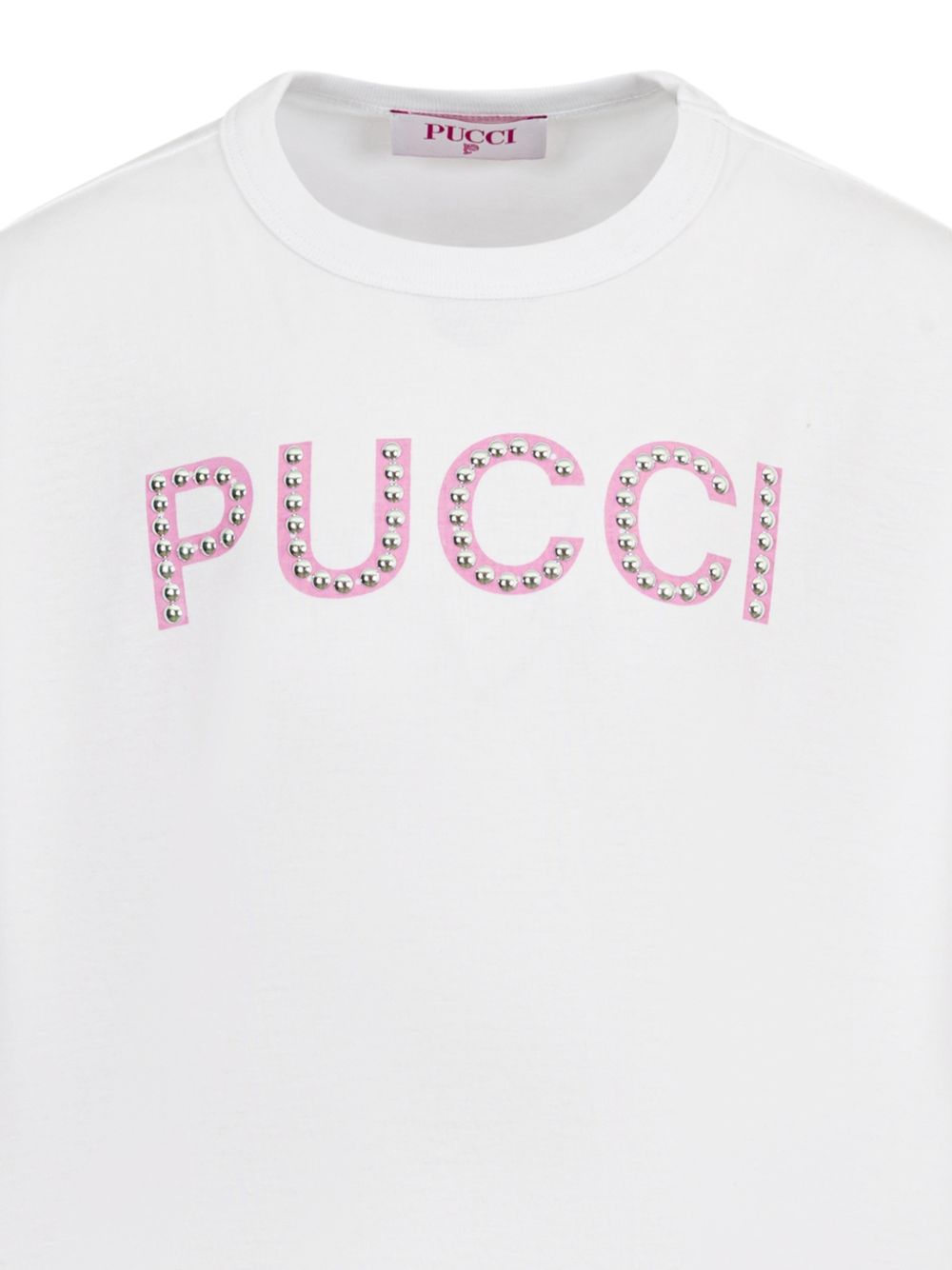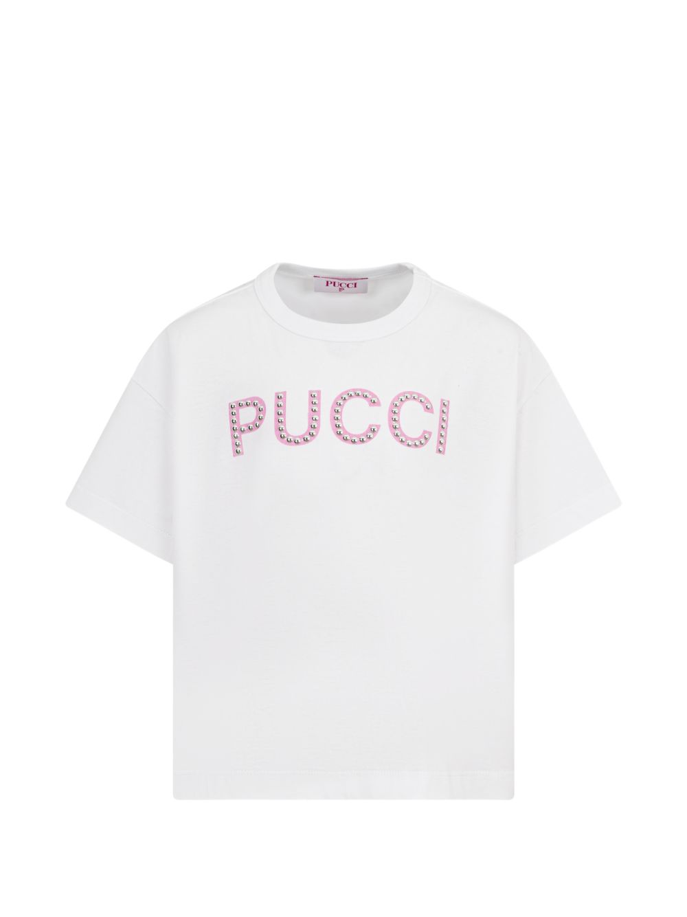 T-shirt bianco, girocollo. maniche corte, logo in lettere, decorazioni con borchie.